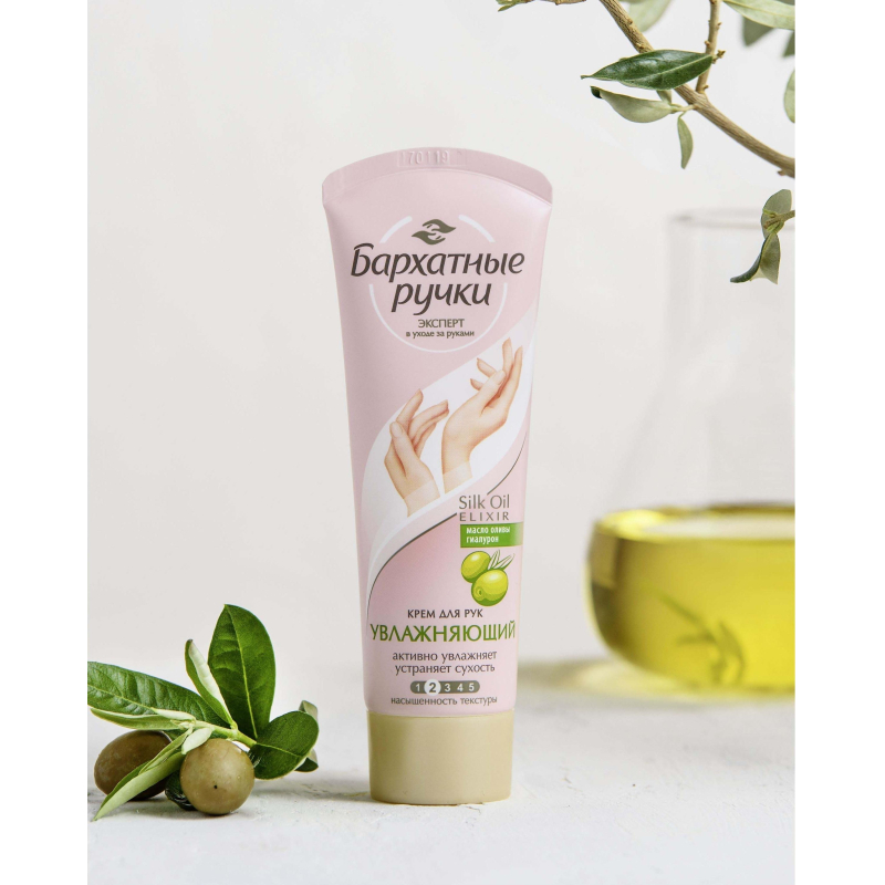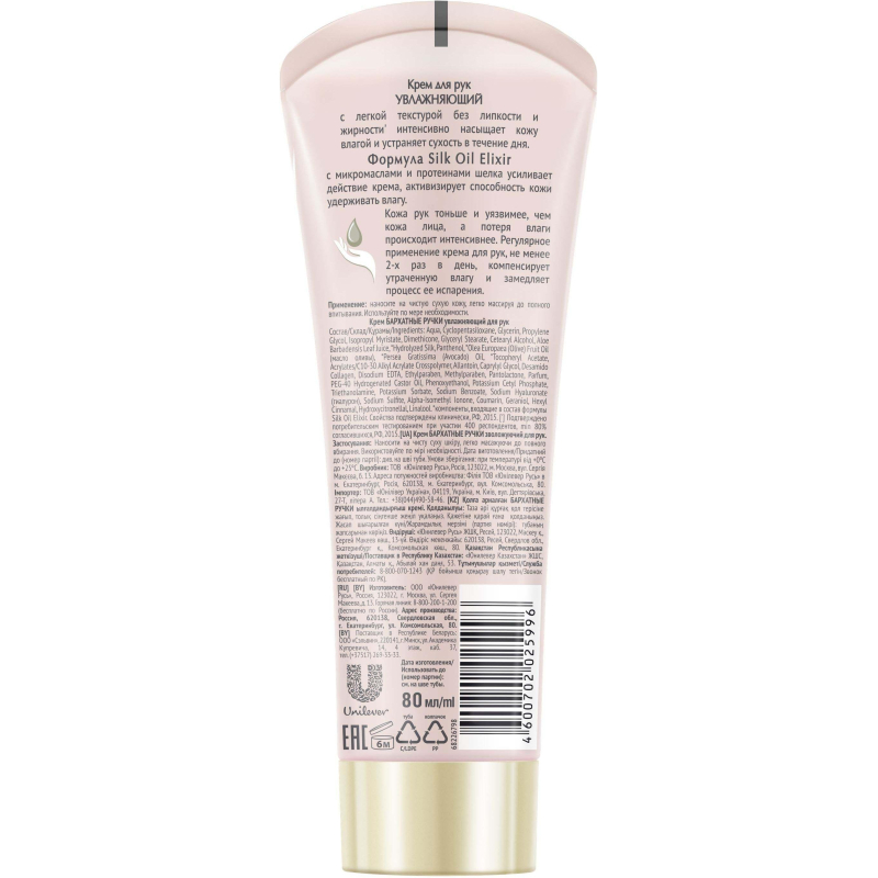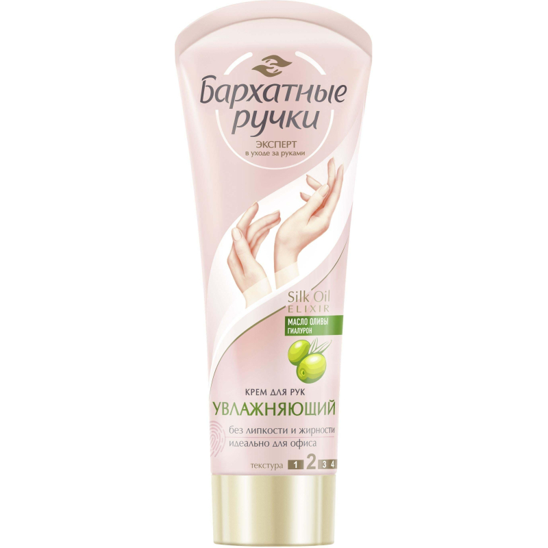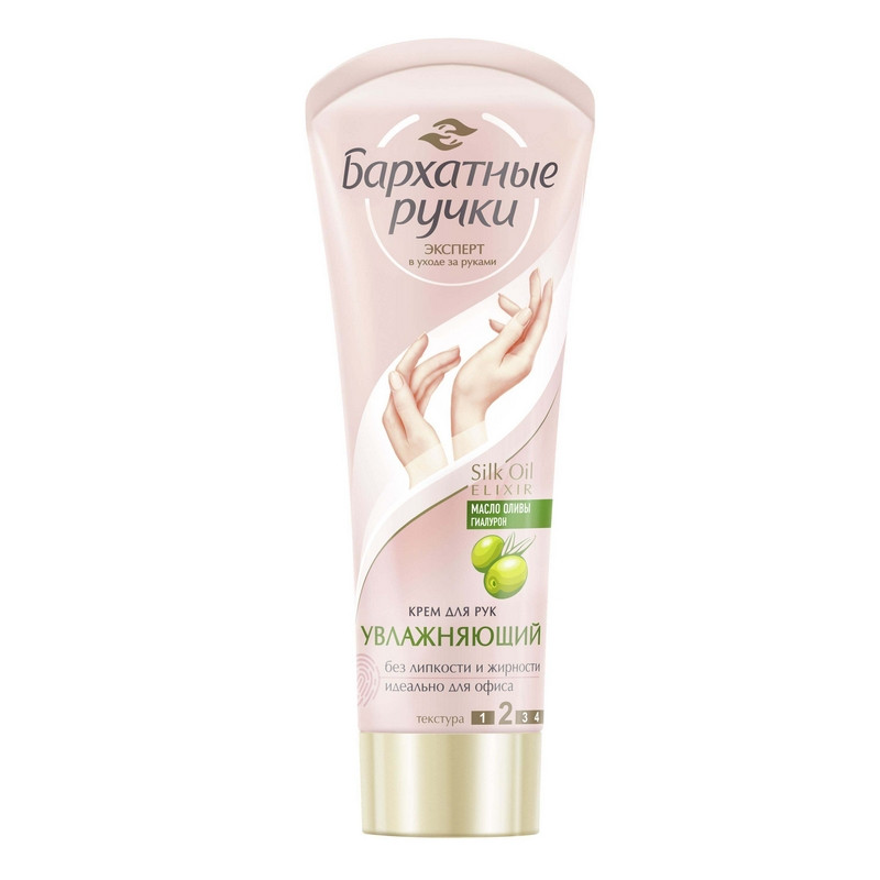"Крем для рук Бархатные ручки Увлажняющий 80 мл. Устраняет сухость, сохраняет влагу в клетках кожи, обладает легкой текстурой. Интенсивно увлажняет, быстро впитывается, не оставляя на руках жирной пленки. Микро-масла в комплексе с протеинами шелка восстанавливают клетки кожи, делают ее мягкой и нежной. Красота и нежность Ваших рук в каждом прикосновении! Способ применения: наносите на чистую сухую кожу, легко массируя до полного впитывания. Используйте по мере необходимости. Состав: Aqua, Caprylic/Capric Triglyceride, Cyclopentasiloxane, sopropyl Isostearate, Isopropyl Myristate, Ethylhexyl Stearate, Glycerin, Glyceryl Stearate, Citrate, PEG-12, Dimethicone, Prunus Amygdalus Dulcis (Sweet Almond) Oil, Glyceryl Stearate, Butyrospermum Parkii (Shea Butter), Cetearyl Alcohol, Potassium Cetyl Phosphate, Betaine, Disodium Cetearyl Sulfosuccinate, Acrylates/C10-30 Alkyl Acrylate Crosspolymer, Triethanolamine, Hydrolyzed Silk, Tocopheryl Acetate, Sodium Ascorbyl Phosphate, Maris Sal, Propylen Glycol, Sorbitol, Carboxymethyl Chitin Liquid, Panthenol, Sodium Hyaluronate,PEG-40 Hydrogenated Castor Oil, Disodium EDTA, Methyparaben, Ethylparaben, DMDM Hydantoin, Phenoxyethanol, Potassium Sorbate, Parfum, Hydroxyisohexyl 3-Cyclohexene Carboxaldehyde."