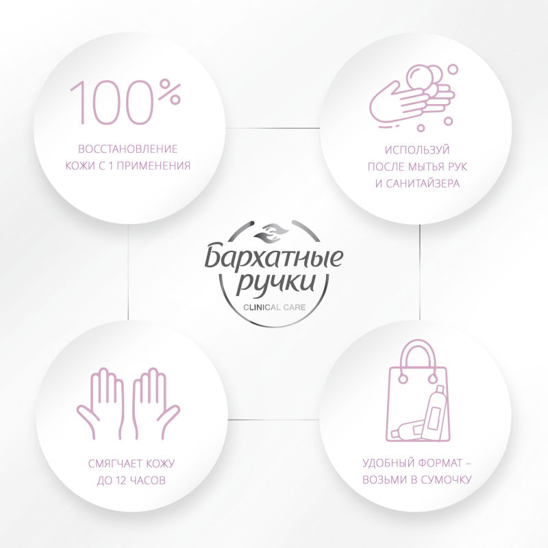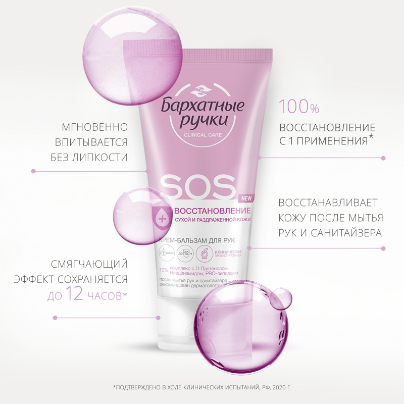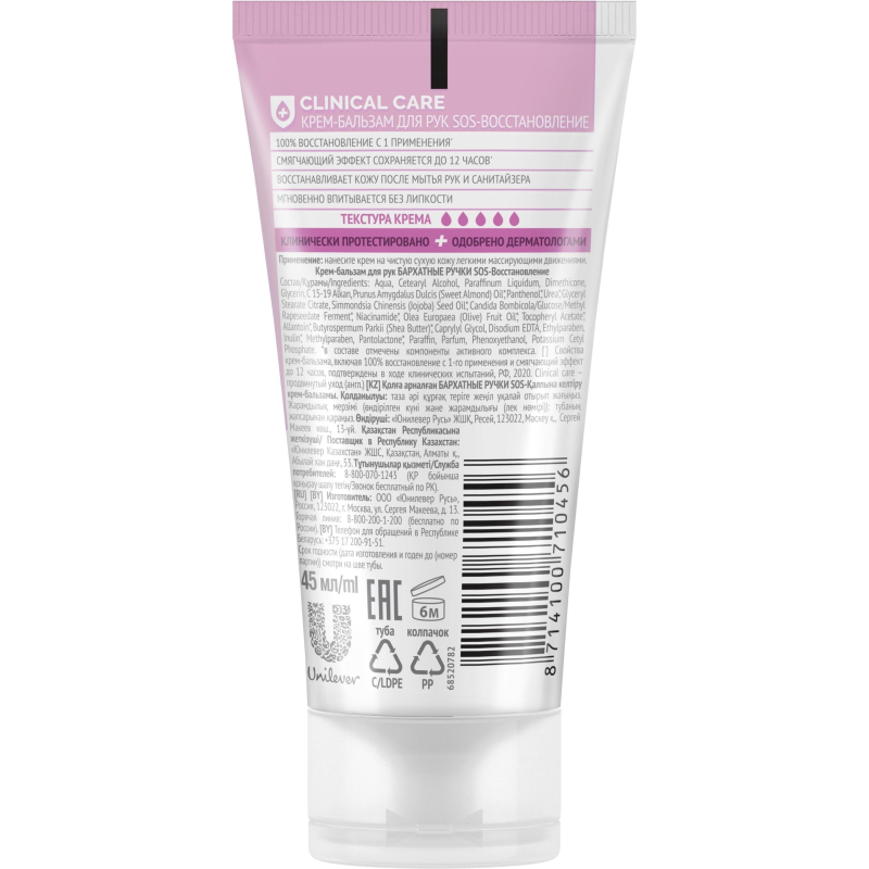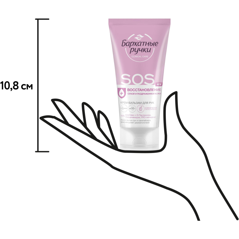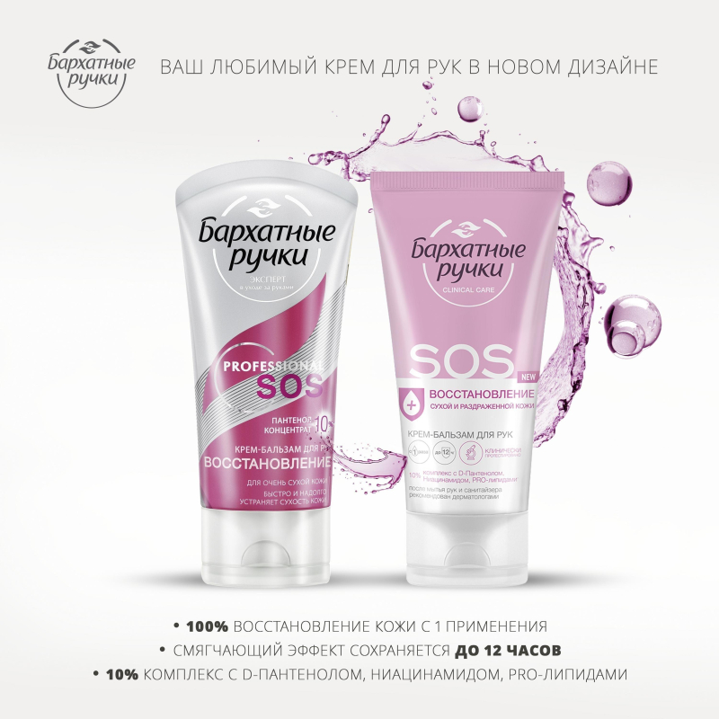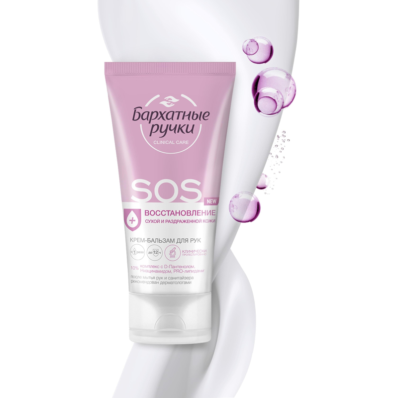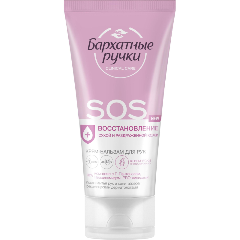 Крем-бальзам для рук Бархатные ручки SOS-восстановление 45 мл. Командой профессионалов в уходе за руками был разработан экстра-восстанавливающий крем-бальзам для рук глубокого действия, который устраняет причины появления сухости, быстро восстанавливает и надолго смягчает кожу рук. Подходит для очень сухой и потрескавшейся кожи. Способ применения: наносите крем на чистую, сухую кожу легкими массирующими движениями. Состав: Aqua, Glycerin, Cetearyl Alcohol, Paraffinum Liquidum, Cyclopentasiloxane, Urea, Dimethicone, Panthenol, Glyceryl Stearate Citrate, Triisostearin, Potassium Cetyl Phosphate, Prunus Amygdalus Dulcis (Sweet Almond) Oil, Simmondsia Chinensis (Jojoba) Seed Oil, Squalane, Aloe Barbadensis Leaf Juice, Tocopheryl Acetate, Allantoin, Dimethyl Sulfone, Biosaccharide Gum-1, Hydrolyzed Silk, Artemia Extract, Caprylyl Glycol, Disodium EDTA, Ethylparaben, Methylparaben, Pantolactone, Paraffin, Parfum, Phenoxyethanol, Potassium Sorbate, Sodium Benzoate, Sodium Sulfite, Alpha-Isomethyl Ionone, Butylphenyl Methylpropional, Citronellol, Hexyl Cinnamal, Hydroxycitronellal, Limonene, Linalool.Товар относится к ценовому сегменту "бюджет". Имеет базовые характеристики и более простую упаковку. Отвечает основным требованиям потребления. Внешний вид и/или характеристики товара могут быть изменены производителем в соответствии с производственным процессом.