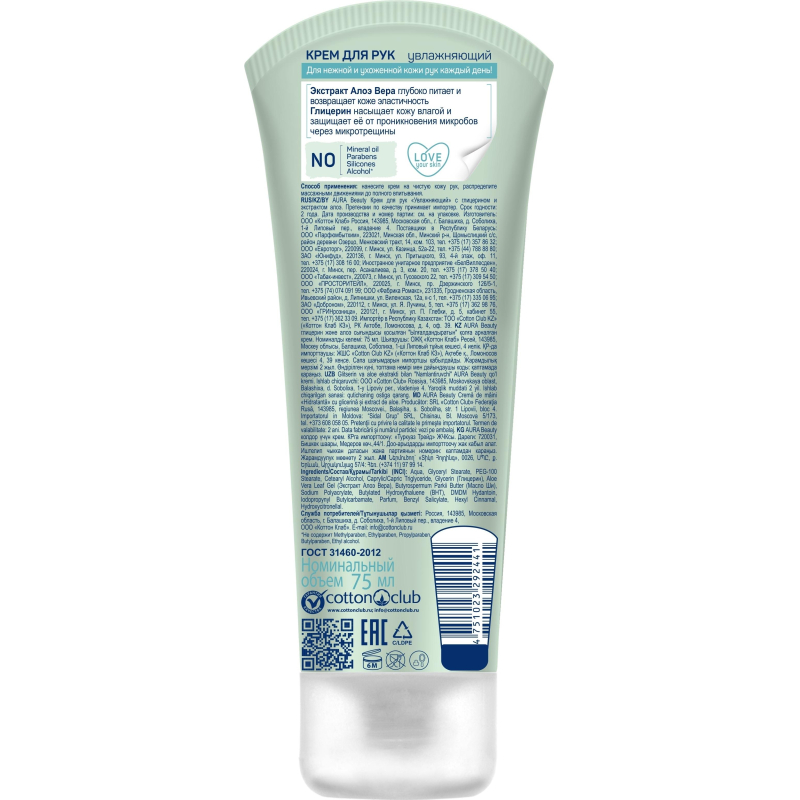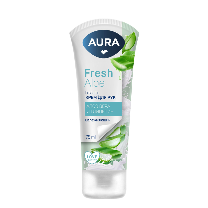 Увлажняющий крем для рук Aura Beauty с глицерином и экстрактом алоэ вера 75 мл. Экстракт алоэ благодаря своему успокаивающему эффекту восстанавливает поврежденные клетки кожи, возвращая ей молодость и гладкость. Глицерин выравнивает структуру кожи, препятствуя появлению стянутости. Крем подарит вашим рукам ощущение комфорта, придаст им ухоженный вид и сделает кожу шелковистой. Способ применения: наносите крем на чистую, сухую кожу легкими массирующими движениями. Состав: Aqua, Glyceryl Stearate, PEG-10 Stearate, Cetearyl Alcohol, Caprylic/Capric Triglyceride, Glycerin, Aloe Vera Leaf Gel, Butyrospermum Parkii Butter, Sodium Polyacrylate, Butylated Hydroxythaluene (BHT), 2-bromo-2-Nitropropane-1,3-Diol, Methylisothiazolinone, Parfum, Benzyl Salicylate, Hexyl Cinnamal, Hydroxycitronellal.