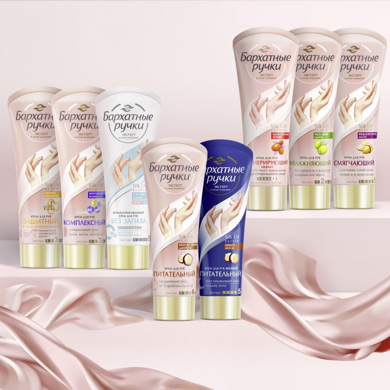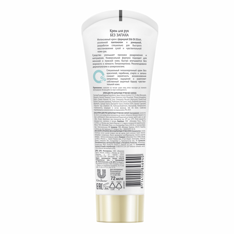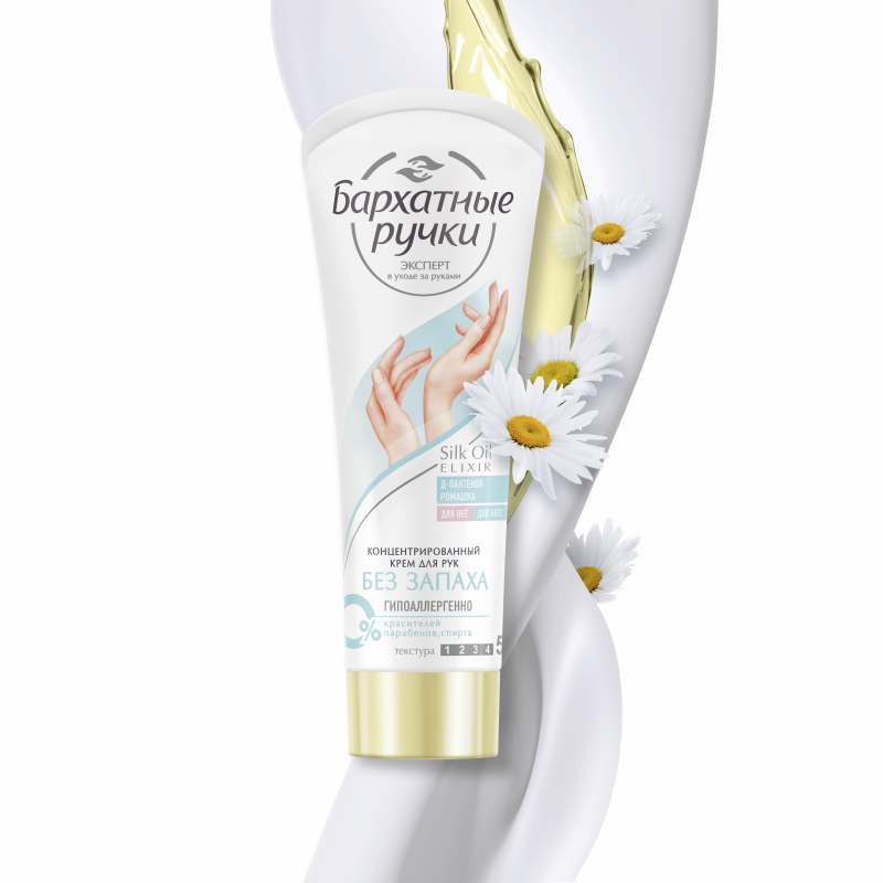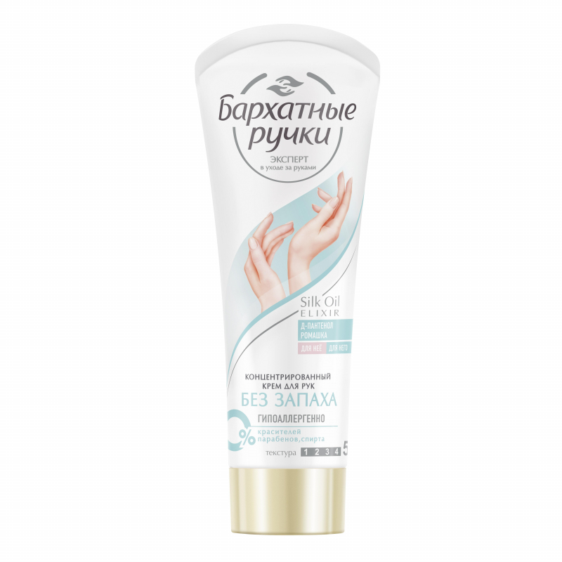 Бренд Бархатные Ручки представляет крем для рук без запаха. Сухая и чувствительная кожа рук требует специального и бережного ухода. Интенсивный крем с формулой Silk Oil Elixir, усиленной пантенолом и ромашкой, разработан специально для быстрого восстановления сухой и чувствительной кожи рук. Отдушки могут являться катализатором аллергии. Многие потребители не могут использовать крема с ярко-выраженным запахом из-за аллергической реакции. Крем Бархатные ручки не содержит отдушки и является гипоаллергенным, подходит для использования в сезон аллергии. Продукт рекомендован дерматологами и аллергологами. Крем обладает густой и ультра насыщенной текстурой, но при этом быстро впитывается без липкости и жирности. Текстура крема без запаха самая насыщенная и концентрированная в основной линейке бренда Бархатные ручки. Крем для рук Бархатные ручки полностью подходит для использования для нее и для него. Универсальная формула крема полностью подходит как для женской, так и для мужской кожи рук. Формула продукта содержит 100% полезные компоненты, без красителей, парабенов, спирта, что снижает вероятность возникновения неприятных ощущений и возникновения аллергической реакции. Крем укрепляет собственный защитный барьер чувствительной кожи для предотвращения воздействия внешних агрессивных факторов. Формула продукта содержит Д-Пантенол и Ромашку: Д-пантенол восстанавливает и увлажняет сухую, чувствительную кожу рук; Ромашка успокаивает сухую и чувствительную кожу рук. Снимает признаки раздражения и шелушения кожи. Способ применения: наносите на чистую сухую кожу, легко массируя. Состав: Aqua, Cetearyl Alcohol, C12-15 Alkyl Benzoate, Glycerin, Glyceryl Stearate Citrate, Potassium Cetyl Phosphate, Prunus Amygdalus Dulcis (Sweet Almond) Oil, Urea, Chamomilla Recutita (Matricaria) Flower/Leaf Extract (экстракт ромашки), Hydrolyzed Silk Extract, Inulin, Panthenol (пантенол), Allantoin, Caprylyl Glycol, Dipropylene Glycol, Disodium EDTA, Glyceryl Caprylate, Glycine Soja (Soybean) Oil, Hydroxyacetophenone, Niacinamide, Pantolactone.