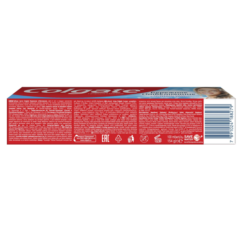 Со временем эмаль теряет свою естественную белизну. Зубная паста Colgate Бережное Отбеливание бережно удаляет потемнения с поверхности зубов, восстанавливая их естественную белизну, и не повреждая зубную эмаль, а также укрепляет эмаль зубов и защищает от кариеса. Благодаря этому вы можете каждый день радовать себя и своих близких ослепительной улыбкой. Произведено с заботой, чтобы Вы могли чаще улыбаться. Рекомендовано: - для ежедневного ухода, - для устранения налета, - для борьбы с неприятным запахом изо рта, - для защиты от кариеса, - для отбеливания зубов. Текстура зубной пасты: паста.