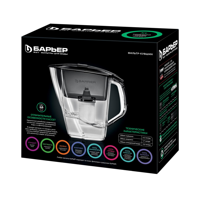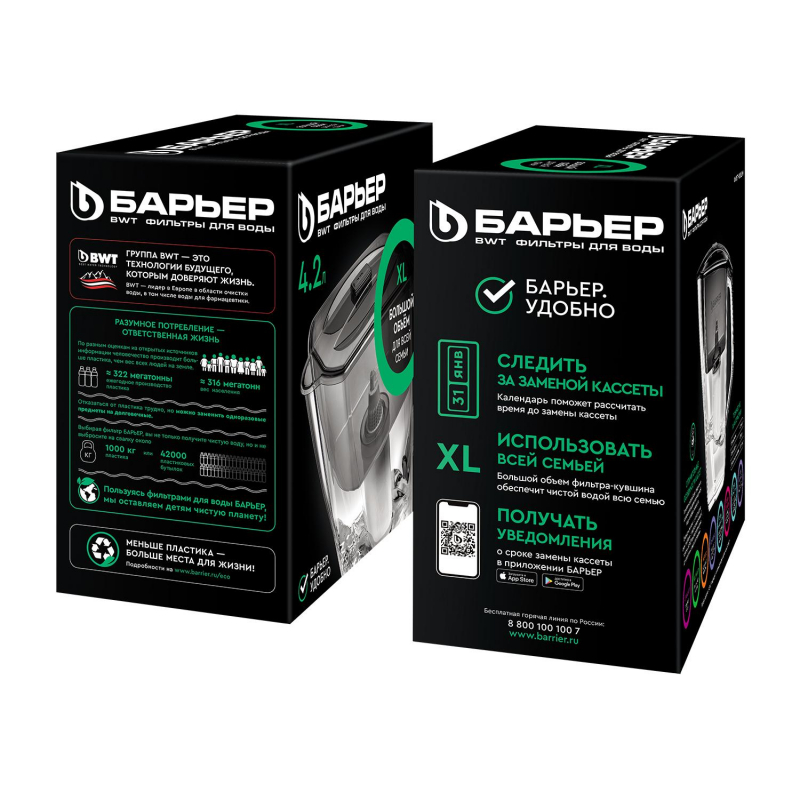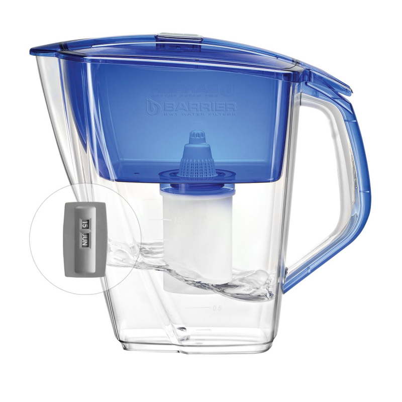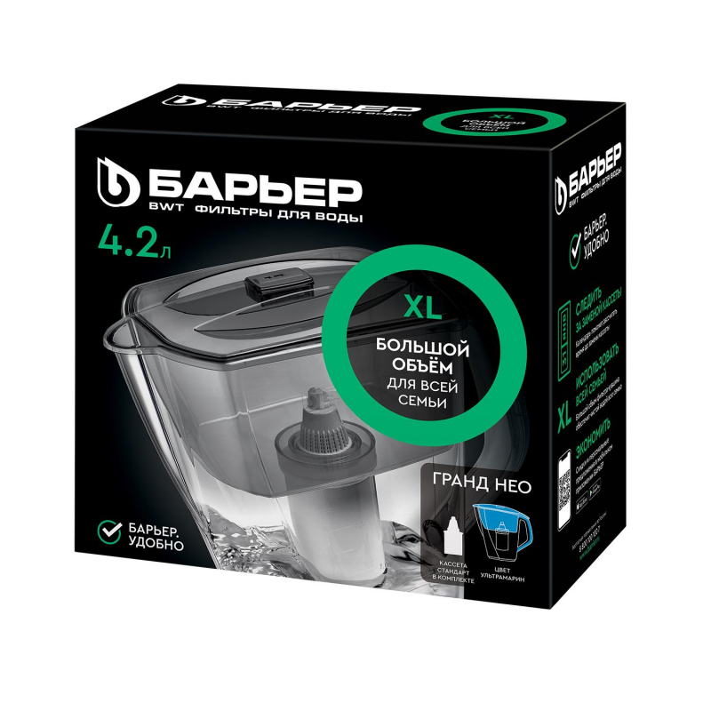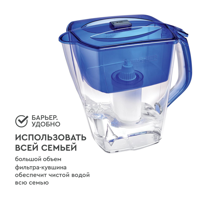 Фильтр-кувшин для очистки воды Барьер Гранд Нео 4.2 л ультрамариновый (В011Р00). Оптимальный выбор для всей семьи! Большой кувшин классической формы с механическим индикатором ресурса. Воронка удобно открывается при наклоне кувшина. Индикатор на крышке подскажет, когда заменить кассету. Цвет: ультрамарин. Общий объем кувшина 4,2 литра, полезный объем 2,3 литра. В комплекте с кувшином кассета Барьер Стандарт, которая защитит от хлора, тяжелых металлов и других вредных примесей. Резьбовое крепление кассеты исключает попадание неочищенной воды в отфильтрованную. Кувшин можно мыть в посудомоечной машине. Одна кассета Барьер способна заменить несколько сотен пластиковых бутылок. По окончанию ресурса кассету можно сдать на переработку.