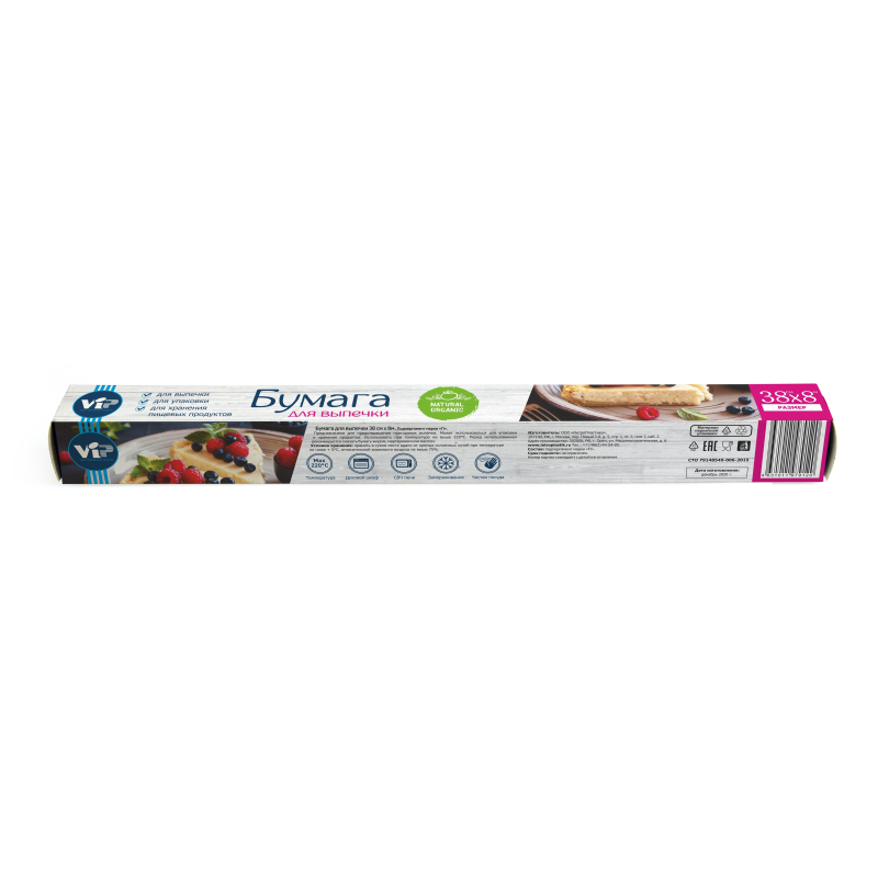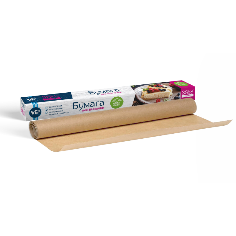 Бумага для выпечки предназначена для предотвращения пригорания выпечки. Посуда и духовой шкаф остаются чистыми. Производится из подпергамента. Данная бумага требует предварительной смазки жиром перед использованием. Может использоваться для упаковки и хранения продуктов. Состав: целлюлоза. Использовать при температуре не выше 220 градусов цельсия. Плотность бумаги 40 г/кв.м.