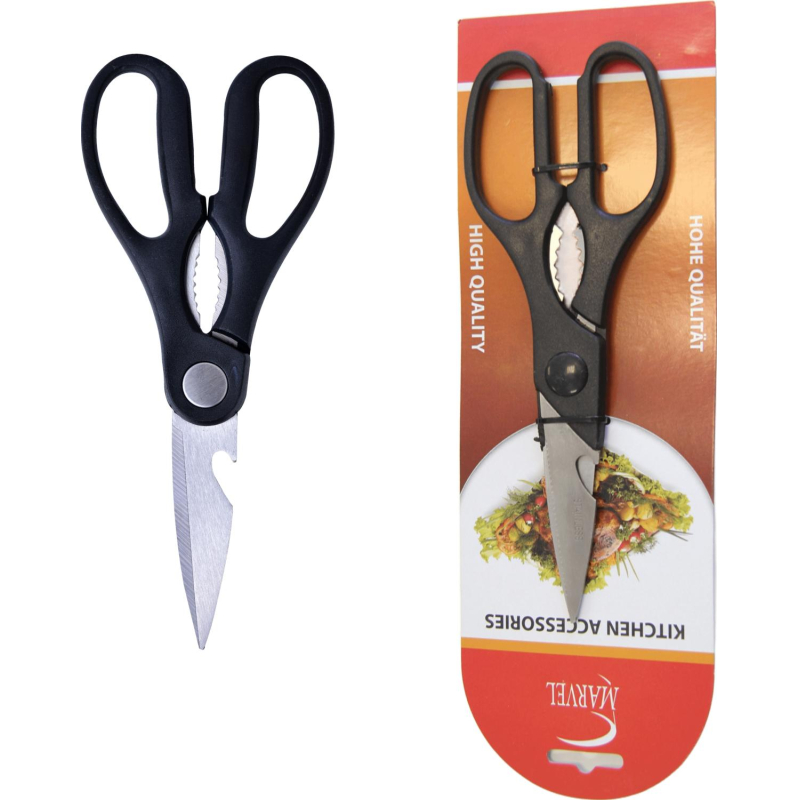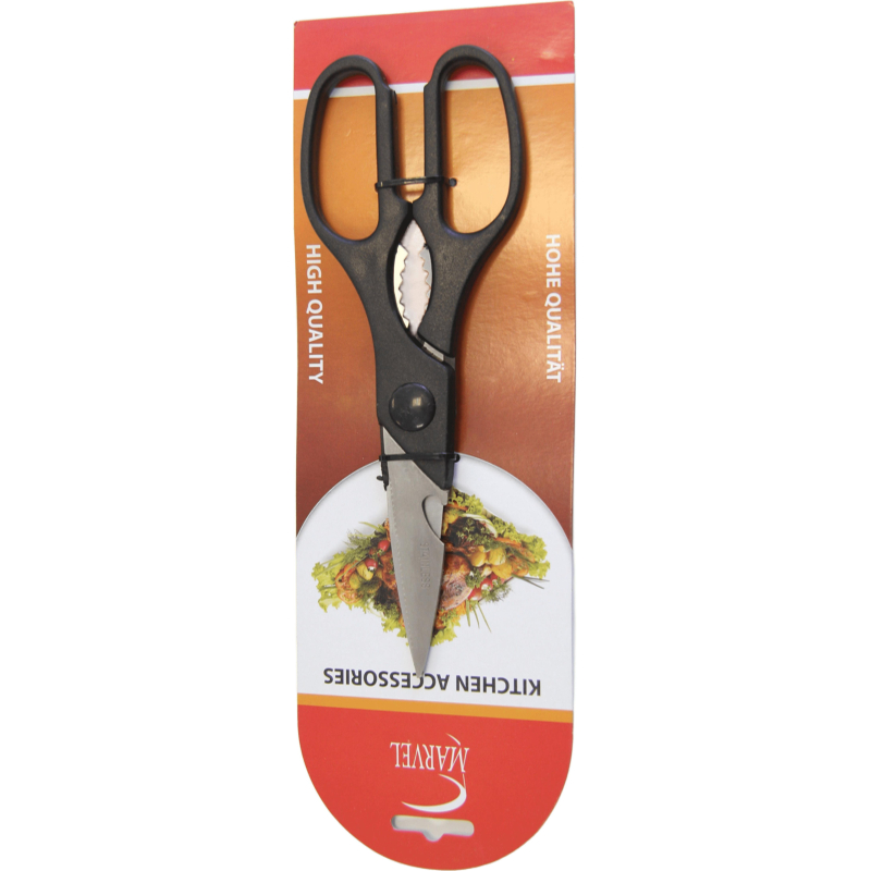 Ножницы кухонные Marvel 21 см. Кухонные ножницы имеют длинные лезвия и мощные ручки. Лезвия у ножниц выполнены из стали, а ручки из прочного пластика. Длина ножниц:21 см. Ножницы можно использовать в посудомоечной машине. <!--noindex-->Товар относится к ценовому сегменту "эконом". Имеет базовые характеристики и более простую упаковку. Отвечает основным требованиям потребления.<!--/noindex--> - перед первым использованием требуется тщательно промыть изделия; - хранить изделия в чистом, сухом виде; - не рекомендуется использовать губки с абразивным слоем; - не рекомендуется промывка изделий в посудомоечной машине с использованием моющих средств, в состав которых входит активный кислород.