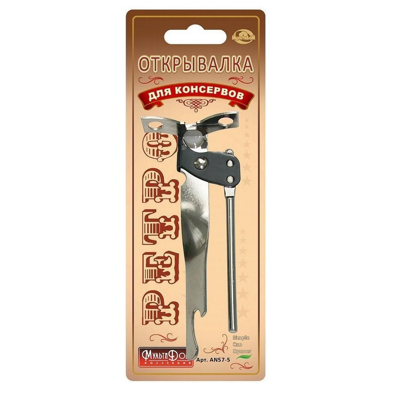 Открывалка для консервов 'Ретро' выполнена в традиционном дизайне. Материал - нержавеющая сталь. Длина изделия составляет 15 см. Специальный механизм позволит вам без лишних усилий открыть любую банку, причем нож в форме диска сделает ее края безопасными. Подходит для консервных банок, банок с закручивающимися крышками и бутылок. Бутылки открываются при помощи специального приспособления на одной из ручек. <!--noindex-->Товар относится к ценовому сегменту "эконом". Имеет базовые характеристики и более простую упаковку. Отвечает основным требованиям потребления.<!--/noindex--> - перед первым использованием требуется тщательно промыть изделия; - хранить изделия в чистом, сухом виде; - не рекомендуется использовать губки с абразивным слоем; - не рекомендуется промывка изделий в посудомоечной машине с использованием моющих средств, в состав которых входит активный кислород.