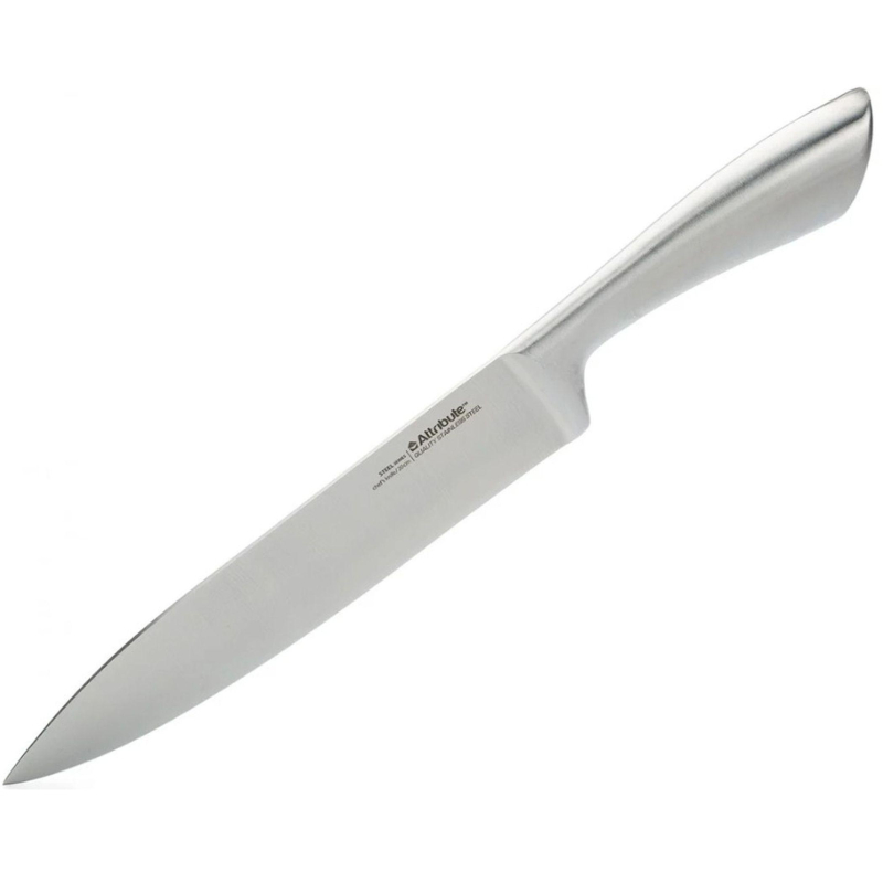 Кухонный нож Attribute - это классическая модель поварского ножа. Изготовленный из нержавеющей стали он не впитывает запахи, не окисляется, не оставляет железного послевкусия. Нож долговечен и удобен в использовании: стальная ручка эргономичной формы не скользит в руке. Стандартный размер ножа обеспечивает удобство его хранения. Острие ножа не потребует постоянной заточки и даст возможность быстро и качественно порезать продукты. Срок службы не ограничен. Можно мыть в посудомоечной машине. Длина лезвия - 20 см. Не рекомендуется использовать в посудомоечной машине . - перед первым использованием требуется тщательно промыть изделия; - хранить изделия в чистом, сухом виде; - не рекомендуется использовать губки с абразивным слоем; - не рекомендуется промывка изделий в посудомоечной машине с использованием моющих средств, в состав которых входит активный кислород.