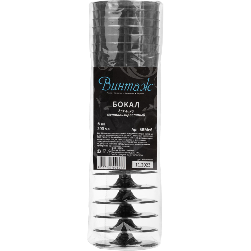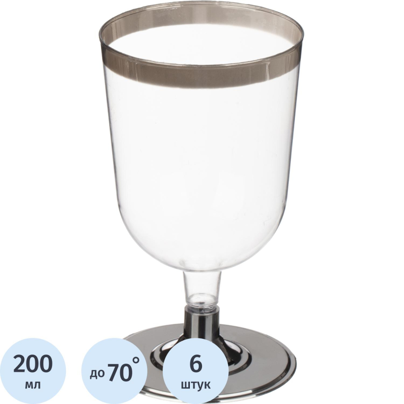 <b>Бокал одноразовый для вина Винтаж пластиковый прозрачный 200 мл 6 штук в упаковке</b> Бокал пластиковый прозрачный предназначен для холодных и горячих напитков (до 70°С). Не допускать контактов с открытым огнем, нагревательными приборами и агрессивными средами. Срок годности не ограничен. Объём 200 мл. 6 штук в упаковке, 56 упаковок в коробе. Верхний диаметр: 68 мм. Нижний диаметр: 50 мм. Высота: 120 мм.