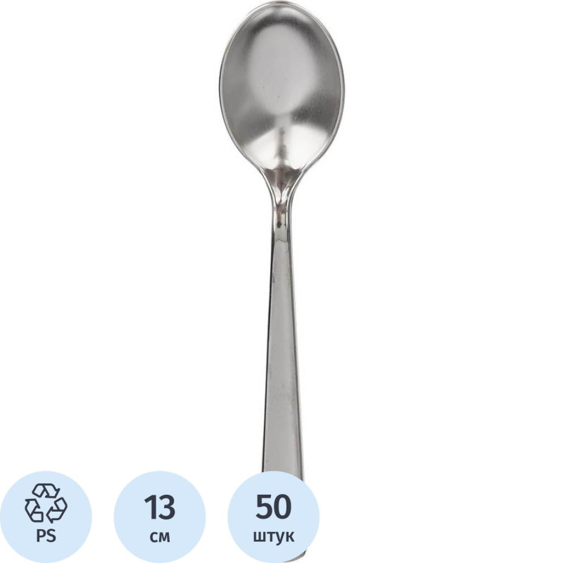 Ложка одноразовая чайная PLMA серебристая 130 мм 50 штук в упаковке. Одноразовые чайные ложки PLMA подходят как для холодных, так и для горячих напитков. Используются на предприятиях общественного питания, в дороге, на пикнике, в домашнем и офисном обиходе. Для изготовления использован высококачественный полистирол серебристого цвета, благодаря чему они смотрятся как многоразовые металлические. Максимальная температура используемых пищевых продуктов +70°С. Имеет премиум дизайн. Длина - 130 мм. В упаковке 50 штук, в транспортном коробе 20 упаковок. Не допускать контакта с открытым огнем, нагревательными приборами и агрессивными средами.