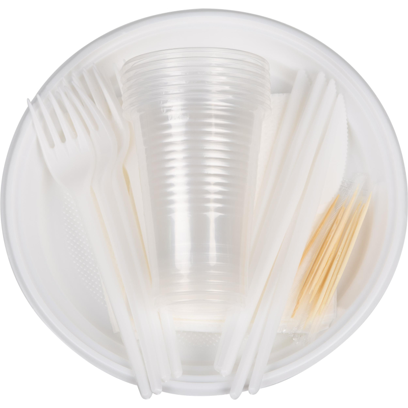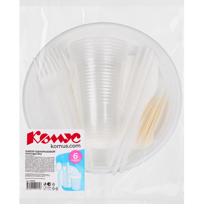 Набор одноразовой посуды №2 Комус на 6 персон (32 предмета). Набор одноразовый посуды 'Комус' № 2 подходит как для холодных, так и для горячих блюд. Максимальная температура используемых пищевых продуктов +70 °С. Пригодится для отдыха на природе, а также корпоративных мероприятий. В набор входят: тарелка белая диаметром 205 мм - 6 штук, стакан белый 200 мл - 6 штук, стакан прозрачный 100 мл - 6 штук, вилка белая - 6 штук, нож белый - 6 штук, салфетки бумажные, зубочистки. Изделия готовы к применению без предварительного промывания водой, не подходят для разогрева еды в микроволновой печи. Набор изготовлен из качественного полипропилена (PP5) и полистирола (PS6).<!--noindex-->Товар произведен под контролем 'Комус'. Мы специально позаботились о Партнерах, которые превыше всего ценят качество и комфорт, и разработали линейку одноразовой посуды самых востребованных размеров для обеспечения быстрого питания в офисе, образовательных и производственных учреждениях, сферы гостеприимства и общественного питания и многих других. Производство расположено в России, что гарантирует постоянный контроль качества и оптимальные цены.<!--/noindex-->