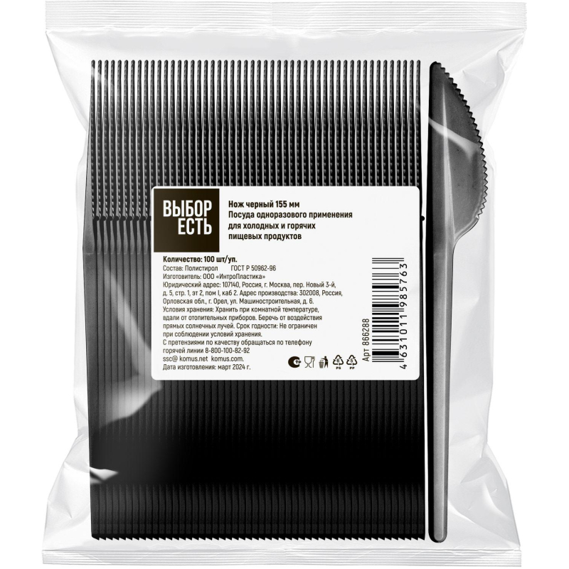 Нож одноразовый пластиковый Выбор есть черный 155 мм (100 штук в упаковке). Посуда одноразового применения из полистирола. Подходит для холодных и горячих (до 75 °С) пищевых продуктов. Используется на предприятиях общественного питания, в дороге, на пикнике, в домашнем и офисном обиходе. Длина 155 мм. 100 штук в упаковке, 40 упаковок в коробе. Данная продукция обладает пониженной плотностью/весом, при некорректной транспортировке или использовании возможна деформация и механические повреждения (разрыв). Температура использования 75°C. Товар произведен под контролем 'Комус'. Мы специально позаботились о Партнерах, которые превыше всего ценят качество и комфорт, и разработали линейку Одноразовой посуды самых востребованных размеров для обеспечения быстрого питания в офисе, образовательных и производственных учреждениях, сферы гостеприимства и общественного питания и многих других. Производство расположено в России, что гарантирует постоянный контроль качества и оптимальные цены. Законодательные и технические документы