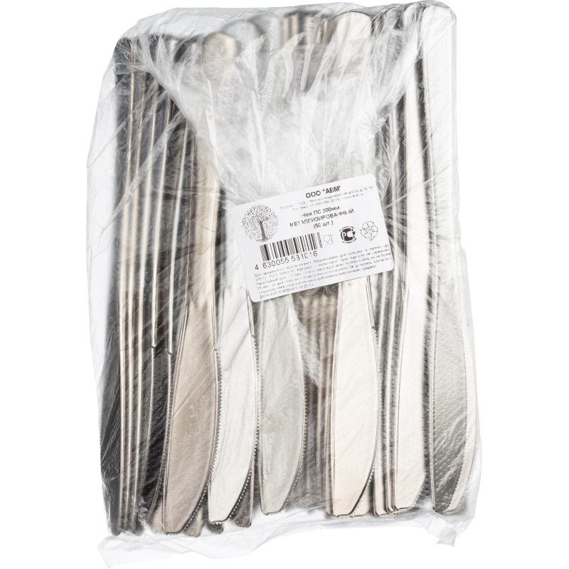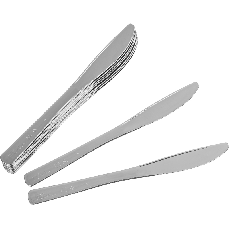 Нож одноразовый PLMA серебристый 200 мм 50 штук в упаковке. Одноразовые ножи PLMA подходят как для холодных, так и для горячих блюд. Используются на предприятиях общественного питания, в дороге, на пикнике, в домашнем и офисном обиходе. Для изготовления использован высококачественный полистирол белого цвета, благодаря чему они легкие и не травмоопасные. Максимальная температура используемых пищевых продуктов +70°С. Имеет премиум дизайн. Длина - 200 мм. В упаковке 50 штук, в транспортном коробе 40 упаковок. Срок годности не ограничен. Не допускать контакта с открытым огнем, нагревательными приборами и агрессивными средами.