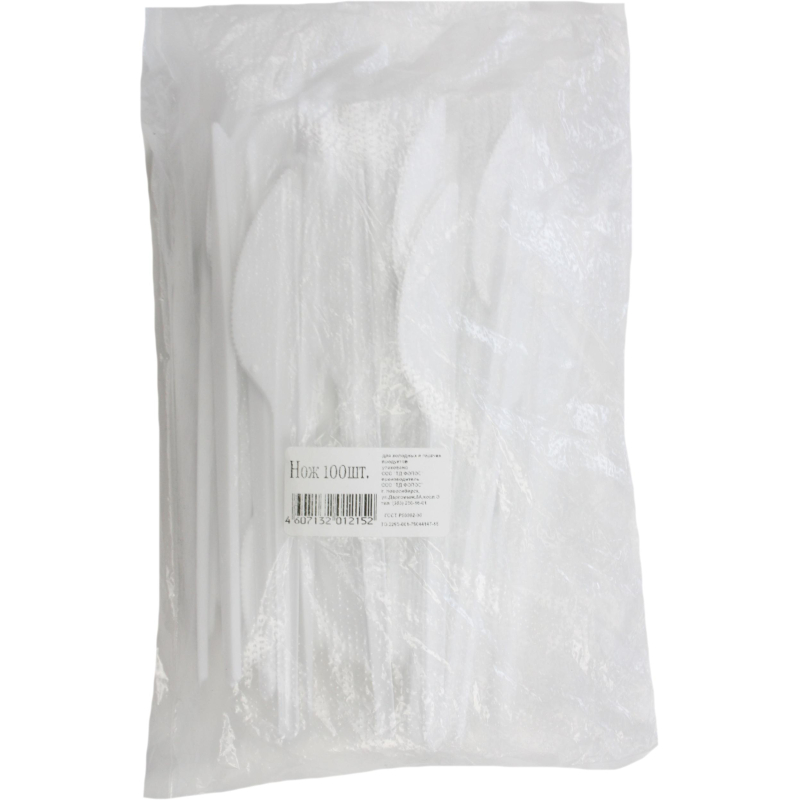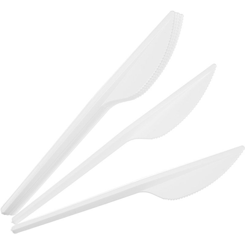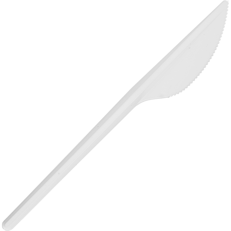 Нож одноразовый белый 160 мм 100 штук в упаковке. Данные одноразовые ножи подходят как для холодных, так и для горячих блюд. Используются на предприятиях общественного питания, в дороге, на пикнике, в домашнем и офисном обиходе. Для изготовления использован высококачественный полистирол белого цвета, благодаря чему они легкие и не травмоопасные. Лезвие имеет зубчики, которыми сложно порезаться, но удобно разделывать пищу. Максимальная температура используемых пищевых продуктов +70°С. Длина - 160 мм. В упаковке 100 штук, в транспортном коробе 40 упаковок.