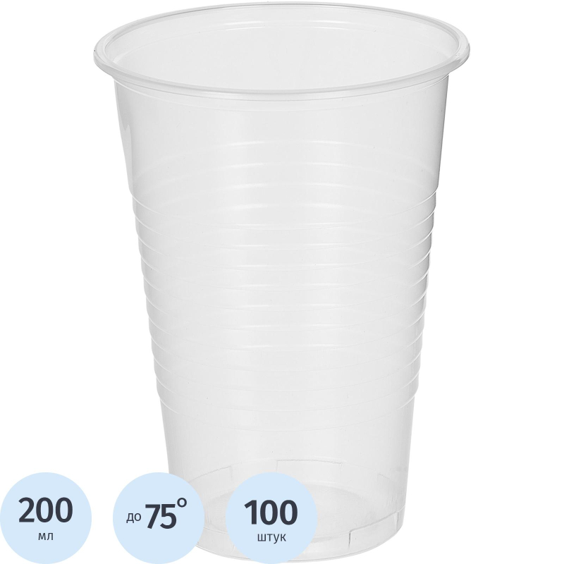 Стакан одноразовый пластиковый 200 мл, прозрачный, 100 штук в упаковке Комус Эконом. Стаканы одноразовые предназначены как для холодных, так и для горячих напитков. Имеют рифленые стенки, изготовлены из прозрачного полипропилена. Максимальная температура жидкости - 75 градусов по Цельсию. Объем одного стакана - 200 мл. Высота стаканчика - 97 мм. Верхний диаметр - 70 мм. Нижний диаметр - 42 мм. Одноразовые стаканы поставляются в упаковках по 100 штук, по 24 упаковки в транспортном коробе. Товар произведен под контролем ?Комус?. Мы специально позаботились о Партнерах, которые превыше всего ценят качество и комфорт и разработали линейку Одноразовой посуды самых востребованных размеров для обеспечения быстрого питания в офисе, образовательных и производственных учреждениях, сферы гостеприимства и общественного питания и многих других. Производство расположено в России, что гарантирует постоянный контроль качества и оптимальные цены.<!--noindex-->Товар относится к ценовому сегменту ?эконом?. Имеет базовые характеристики и более простую упаковку. Отвечает основным требованиям потребления.<!--/noindex--><!--noindex-->Внешний вид и/или характеристики товара могут быть изменены производителем в соответствии с производственным процессом.<!--/noindex-->
