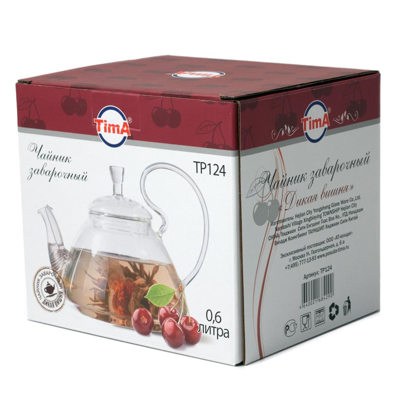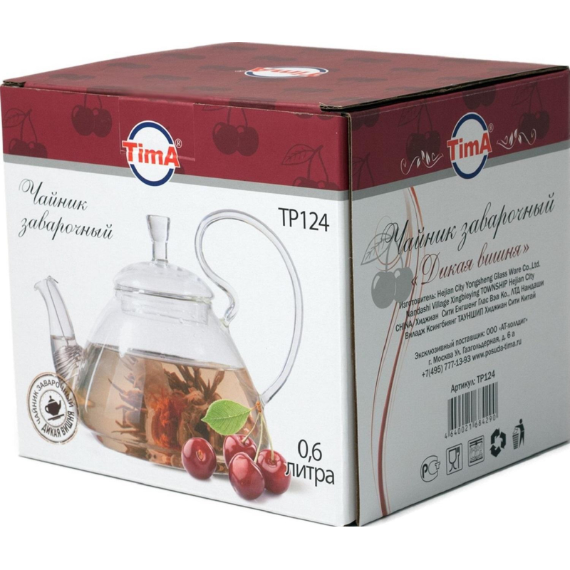 Чайник заварочный Tima Дикая вишня стеклянный/нержавеющая сталь 600 мл. Чайник заварочный Tima Дикая Вишня выполнен в классическом стиле. Корпус чайника изготовлен из боросиликатного стекла. Длинный носик позволяет быстро и без усилий разлить чай в чашки. Специальная форма носика не дает образовываться нежелательным каплям. Стекло - абсолютно инертный материал не вступает в контакт с содержимым, никак не влияет на вкус и аромат напитка, не боится кислот. Заварочные чайники, изготовленные из стекла, подходят для всех видов и сортов чая, а также травяных и фруктово-ягодных напитков, какао и кофе. Можно использовать для молока и бульонов. Преимущества стеклянных чайников: - экологичность, стекло не вступает в химическую реакцию с водой или смесями для заварки, поэтому сам корпус прибора никак не влияет на вкусовые качества напитка; - стекло легко мыть, это можно делать даже в посудомоечной машине и применять жесткие абразивы; - полотно стекла не способно впитывать другие запахи, поэтому вкус напитка всегда остается неизменным; - стеклянные модели всегда вписываются в сервировку и не будут выделяться даже на фоне сервиза, как это может быть с чайниками из фарфора или глины. Объем: 600 мл. <!--noindex-->Товар относится к ценовому сегменту "эконом". Имеет базовые характеристики и более простую упаковку. Отвечает основным требованиям потребления.<!--/noindex-->