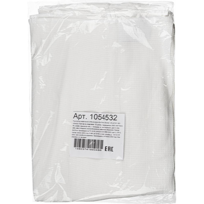 Полотенце вафельное 45x70 см 145 г/кв. м белое 10 штук в упаковке Полотенце техническое вафельное отбеленное, свернуто и упаковано в пакет. Полотенце произведено из натурального хлопка, имеет два обработанных края под оверлок, обработанные края вверх и низ. Вафельное полотенце обладает высокой гигроскопичностью и считается одним из лучших обтирочных и протирочных материалов, подходит для бытовых и хозяйственных потребностей, применяется в промышленности. Полотенце способно удалить любые виды жидкостей и загрязнений, так как имеет прекрасные впитывающие способности, просто отжимается, быстро высыхает, используется в качестве ветоши, для уборки пыли, грязи и т. д. Размер: 45х70 см. Состав ткани: 100 % хлопок. Рекомендации по уходу: стирка при 40 градусах руками или в машине. При этом для них подходит любое моющее средство. Сушить полотенца из хлопка важно на открытом воздухе. Гладить полотенца из хлопка нужно паровым утюгом. Упаковка: пакет. Внимание! Перед использованием обязательна стирка! <!--noindex-->Товар относится к ценовому сегменту "эконом". Имеет базовые характеристики и более простую упаковку. Отвечает основным требованиям потребления.<!--/noindex-->