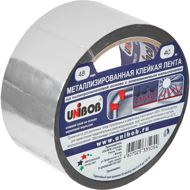 Металлизированная клейкая лента Unibob с алюминиевым напылением применяется для различных типов строительных и ремонтных работ. Лента изготовлена на полипропиленовой основе с алюминиевым напылением, клеевой слой на акриловой основе обеспечивает высокую адгезию. Используется для герметизации соединительных швов воздуховодов, труб, монтажа вентиляционных систем и систем кондиционирования. Подходит для ремонта и восстановления декоративных элементов из алюминия. Также применяется для предотвращения коррозии поверхностей, защиты оборудования от проникновения пыли, пара, других нежелательных сред. С помощью металлизированной ленты просто выполнить герметизацию поверхностей и стыков как на производстве, так и в быту. Важнейшим достоинством ленты с металлизированным напылением является ее свойство отражать ультрафиолетовое излучение. Из-за таких свойств она широко используется для термоизоляции и в иных ремонтных работах. Температура крепления: от 10 до 30 градусов по Цельсию. Рабочая температура : от 10 до 95 градусов по Цельсию. Толщина ленты - 50 мкм. Цвет: серый. Ширина ленты - 48 мм, длина намотки - 40 м. Количество в упаковке: 1 шт. Количество упаковок в транспортном коробе: 36.