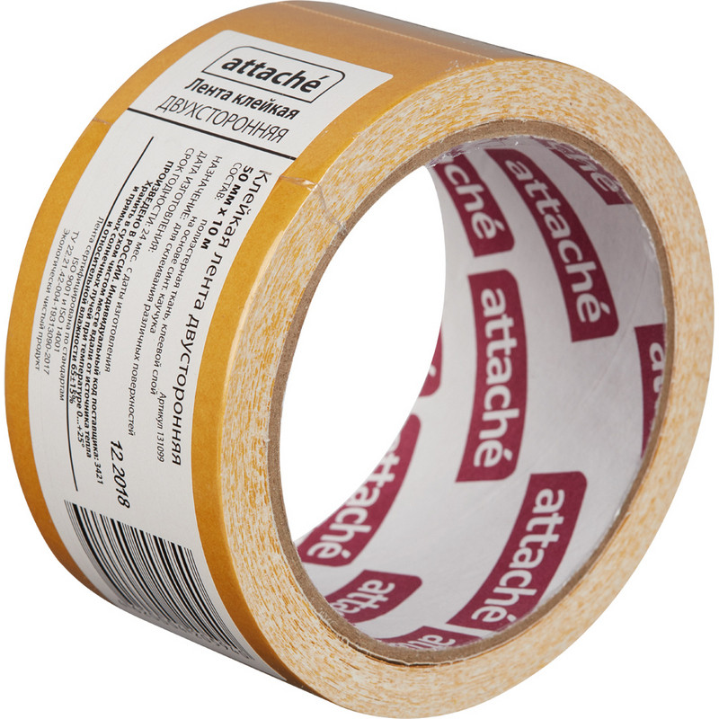 Клейкая лента двусторонняя монтажная Attache белого цвета на тканевой основе с клеевым слоем, изготовленным на основе синтетического каучука. Применяется при отделочных, монтажных и ремонтных работах. Общая толщина ленты- 147 мкм. Длина - 10 м. Ширина - 50 мм. Рабочая температура: от 10 до 50 градусов. Предел прочности при разрыве, N/см - 45. Количество лент в упаковке - 1 шт. Количество упаковок в коробе - 36 шт. Цвет защитной отрывной пленки желтый. Перед применением следует удалить данный слой на необходимом для работы участке.