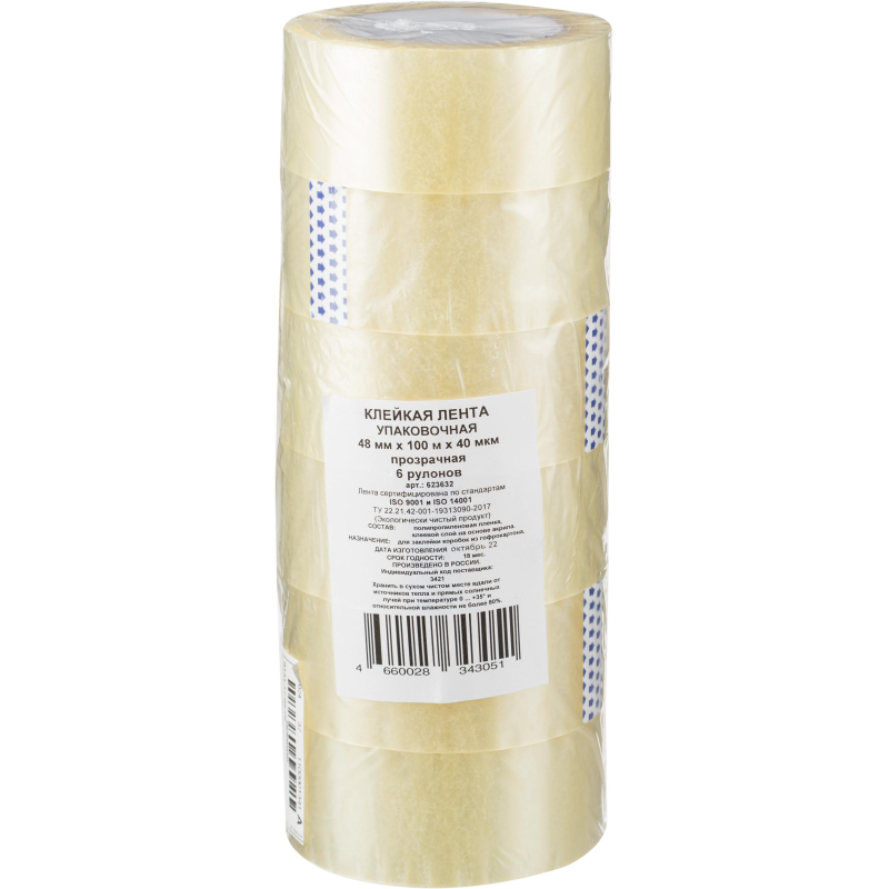 Упаковочная клейкая лента толщиной 40 мкм изготовлена на основе прозрачного полипропилена. Отличается высокой адгезией клея (слипанием с поверхностью), стойкостью к разрыву. Ширина ленты - 48 мм, длина рулона - 100 м. Широкая клейкая лента предназначена для упаковки объемных и тяжеловесных грузов, не теряет свойств на открытом воздухе при температуре от 10 до 30°C. Не хранить под прямыми солнечными лучами. Количество лент в упаковке 6 штук. Количество упаковок в транспортном коробе 6 штук. Ленту липкую хранят в вертикальном положении в крытых складских помещениях, при температуре от +5 до +30°С. Перед использованием липкую ленту необходимо выдержать при температуре выше +20°С не менее 24 часов.