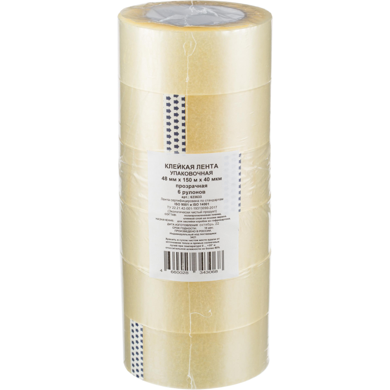 Упаковочная клейкая лента толщиной 40 мкм изготовлена на основе прозрачного полипропилена. Отличается высокой адгезией клея (слипанием с поверхностью), стойкостью к разрыву. Ширина ленты - 48 мм, длина рулона - 150 м. Широкая клейкая лента предназначена для упаковки объемных и тяжеловесных грузов, не теряет свойств на открытом воздухе при температуре от 10 до 30°C. Не хранить под прямыми солнечными лучами. Количество лент в упаковке 6 штук. Количество упаковок в транспортном коробе 6 штук. Ленту липкую хранят в вертикальном положении в крытых складских помещениях, при температуре от +5 до +30°С. Перед использованием липкую ленту необходимо выдержать при температуре выше +20°С не менее 24 часов.