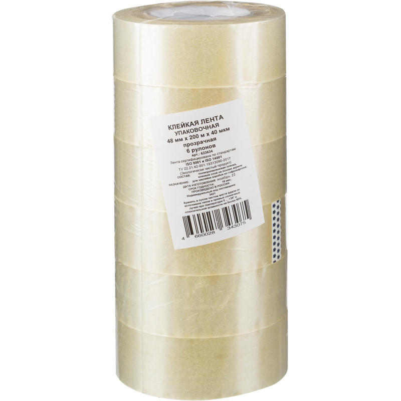 Упаковочная клейкая лента толщиной 40 мкм изготовлена на основе прозрачного полипропилена. Отличается высокой адгезией клея (слипанием с поверхностью), стойкостью к разрыву. Ширина ленты - 48 мм, длина рулона - 200 м. Широкая клейкая лента предназначена для упаковки объемных и тяжеловесных грузов, не теряет свойств на открытом воздухе при температуре от 10 до 30°C. Не хранить под прямыми солнечными лучами. Количество лент в упаковке 6 штук. Количество упаковок в транспортном коробе 4 штуки. Ленту липкую хранят в вертикальном положении в крытых складских помещениях, при температуре от +5 до +30°С. Перед использованием липкую ленту необходимо выдержать при температуре выше +20°С не менее 24 часов.