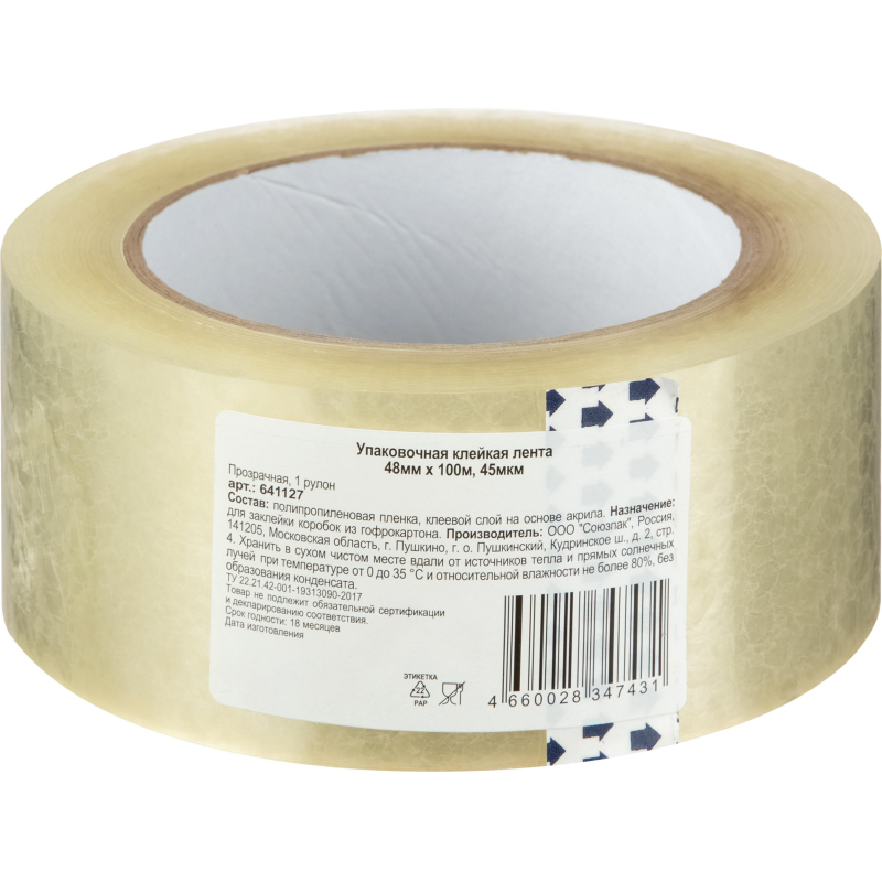 Упаковочная клейкая лента толщиной 45 мкм изготовлена на основе прозрачного полипропилена. Отличается высокой адгезией клея (слипанием с поверхностью), стойкостью к разрыву. Ширина ленты - 48 мм, длина рулона - 100 м. Широкая клейкая лента предназначена для упаковки объемных и тяжеловесных грузов, не теряет свойств на открытом воздухе при температуре от 10 до 30°C. Не хранить под прямыми солнечными лучами. Количество лент в упаковке 1 штука. Количество упаковок в транспортном коробе 36 штук. Ленту липкую хранят в вертикальном положении в крытых складских помещениях, при температуре от +5 до +30°С. Перед использованием липкую ленту необходимо выдержать при температуре выше +20°С не менее 24 часов.