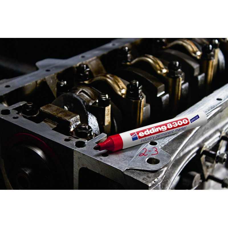 Маркер для агрессивной среды Edding E-8300 - разрабатывался как промышленный перманентный маркер для маркировки на жирной и пыльной поверхности. Маркер Edding E 8300 представляет собой отличное решение для маркировки вне помещения - там, где поверхность подвержена воздействию влаги и пыли. Маркер широко используется в нефтегазовом секторе, в металлопрокате и при изготовлении металлоконструкций, автомобильной промышленности, а также в климатических условиях с повышенной влажностью. Корпус маркера изготовлен из алюминия, пишущий узел промышленного маркера обладает дополнительно усиленным круглым пулевидным наконечником, устойчивым к истиранию. Чернила отличаются повышенной концентрацией пигментов, а так же в состав входят дополнительные компоненты, растворяющие масляную пленку при написании по поверхности. Чернила перманентные, светостойкие, водостойкие, устойчивы к кислотам и растворителям. Размеры маркера: диаметр 15 мм, длина 141 мм. Инструкция по применению маркера: 1. Перед использованием хорошенько встряхнуть с закрытым колпачком. 2. Снимите колпачок, прижмите наконечник к поверхности, надавите и удерживайте пока не проступит краска. 3. Применять после того как убедитесь, что вытекает исходный цвет. Предостережение: плотно закрывайте колпачок после применения, держите маркер вдали от огня и прямых солнечных лучей.