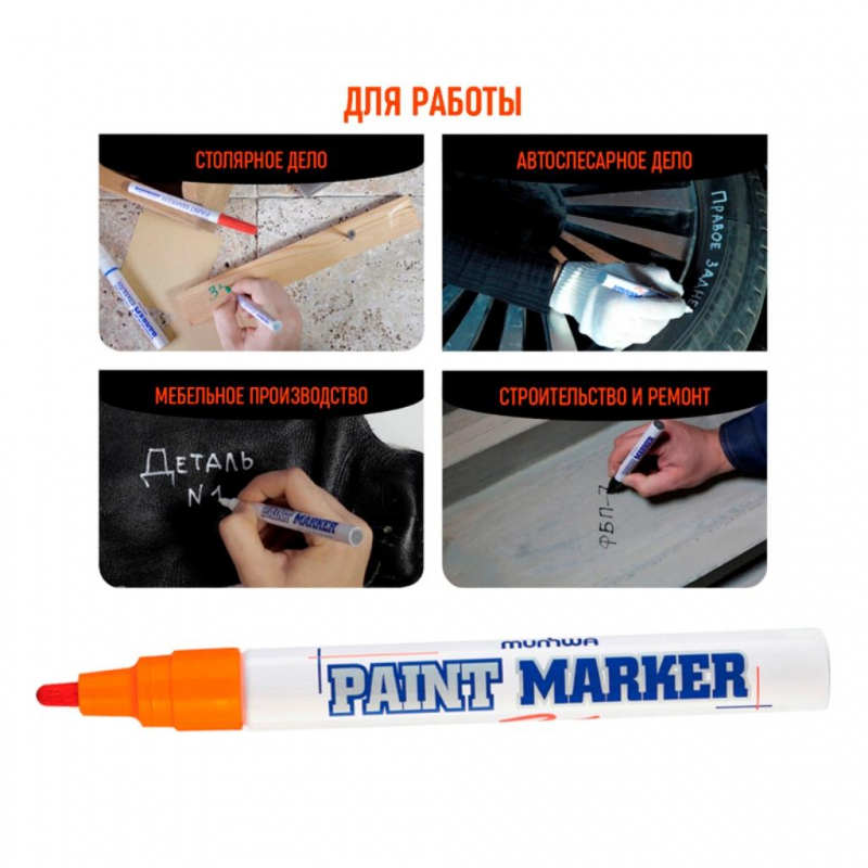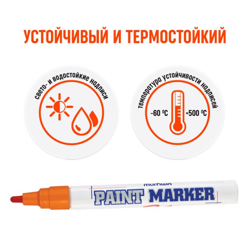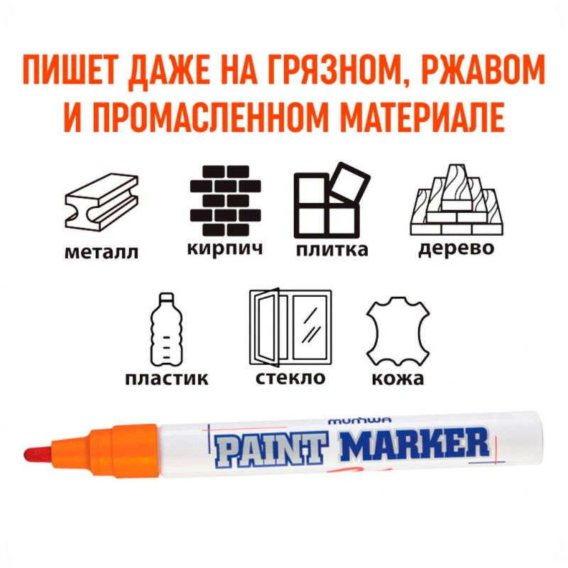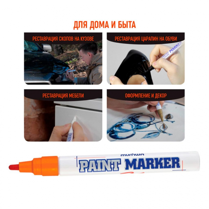 Маркер - краска MunHwa - профессиональный лаковый маркер на нитрооснове. Paint Marker MunHwa пишет на всех типах поверхностей: металл, дерево, резина, бетон, стекло, кожа. Цвет чернил - оранжевый, диаметр пишущего узла - 4 мм. Количество краски - 10 г. Размеры маркера: диаметр 15 мм, длина 144 мм. Paint Marker подходит для реставрации дефектов на бытовой технике, обуви, кузове автомобиля, а также надписей на каменных плитах. Маркер-краска MunHwa имеет широкое применения в дизайне, декорировании и оформлении. Корпус маркера изготовлен из прочного алюминия. Клапанный механизм пишущего узла исключает растекание и разбрызгивание краски, преждевременное пересыхание маркера, срок годности 5 лет. Благодаря высококачественным чернилам, краска ложиться на поверхность равномерным и однородным слоем, полностью закрашивая обрабатываемую поверхность, быстро сохнет. После высыхания, надписи обладают свето- и водостойкостью, термостойкостью, устойчивостью к механическим воздействиям. Инструкция по применению: 1) Встряхнуть маркер с закрытым колпачком. 2) Открыть колпачок. Удерживая маркер в вертикальном положении, несколько раз надавить стержнем на поверхность до тех пор, пока краска не поступит на пишущих узел. 3) Выполнить надпись или рисунок. Дать составу высохнуть в течение 40-60 секунд. 4) Плотно закрыть колпачок.