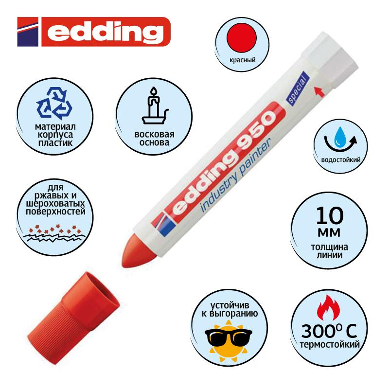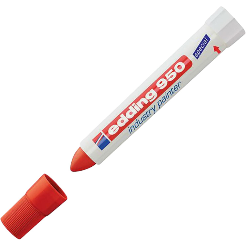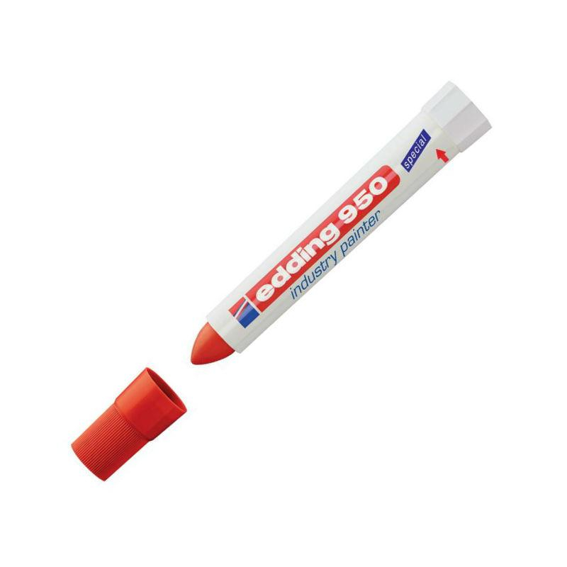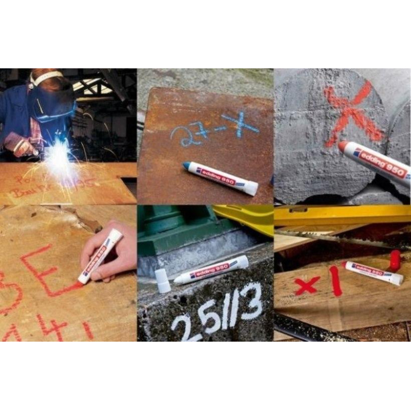 Маркер для промышленной графики Edding E 950 изготовлен на основе водостойкой пигментированной мастики, предназначен для нанесения постоянных, не удаляемых надписей на любые гладкие и шершавые поверхности. Идеально подходит для работ по следующим поверхностям: металлу, дереву, стеклу, картону, пластику, керамике и т. д. Маркер является универсальным, что позволяет маркировать такие поверхности, как влажное дерево, грязный, ржавый металл, пленки, кафель и многих других. Возможно использование по необработанному металлу, по бетону, кирпичу на строительстве, везде, где невозможно использовать маркер с фетровым наконечником. Надпись, нанесенная маркером Edding E 950, устойчива к выгоранию, к смыванию водой, истиранию механическим путем. Корпус промышленного маркера изготовлен из прочного пластика. В маркере Edding E 950 в качестве маркирующего вещества используется высокостойкая пигментная, плотно ложащаяся мастика. Мастика застывает через несколько секунд после ее нанесения на маркируемую поверхность. У фирмы Edding есть положительный опыт использования индустриального маркера Edding E 950 при проведении подводных работ. Благодаря водостойким свойствам мастики, данным маркером можно делать широкие, хорошо заметные надписи под водой и на предметах, длительное время находящихся в воде. Температурный режим нанесенной и высохшей краски маркера - до 300 °C. Температура поверхности при нанесении - не более 100 °C.