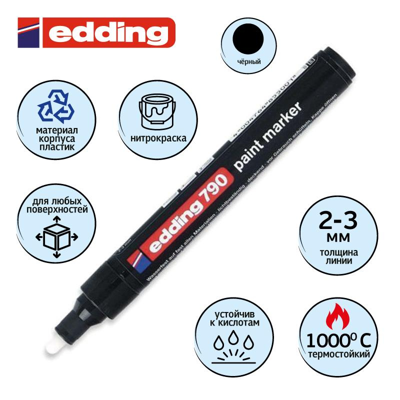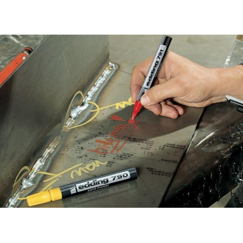 Более экономичная версия универсального маркера - маркер Edding 790 используется для промышленной непрозрачной маркировки практически всех материалов, например, стекла, пластика, дерева или металла. Может применяется для письма на жирных, пыльных, грязных поверхностях. Лаковый маркер устойчив к кислотам, растворителям, механическому истиранию, свету. Высококонцентрированный пигмент хорошо ложится на гладкие и шероховатые поверхности. Специальные добавки, введенные в состав маркера Edding E 790 растворяют, масляную пленку на поверхности письма. Непрозрачные лаковые чернила позволяют делать хорошо заметные надписи густым плотным слоем даже на темных поверхностях. Корпус промышленного маркера изготовлен из пластика. Маркер Edding E 790 имеет упроченный круглый (пулевидный) наконечник. Наконечник маркера может быть заменен по мере истирания. Благодаря тонкому наконечнику маркером может наносится маркировка на небольшие элементы и поверхности. Толщина линии - 2-3 мм. Поток чернил регулируется клапаном. Чернила маркера с лакирующим эффектом на основе нитрокраски. Водостойкий, быстро сохнет. Термостойкость надписи до 4 00 градусов по Цельсию. А надписи цветами 05-010, 049, 054 хорошо видимы до 1000 градусов по Цельсию. Маркер Edding E 790 хорошо зарекомендовал себя в работе при перепадах температур от -15 до 30. Промышленный лаковый маркер Edding Е-790 универсален. Используется, например, при нанесении меток на разнородные материалы. При маркировке изделий из резины, пластика, стекла, металла, кабеля, проводов, при нанесении маркировки на товары достаточно одного маркера - Edding E 790. Идеально подходит для маркировки грузов, приборостроения, технологической маркировки. Кроме того, маркер Edding E 790, благодаря разнообразной палитре цветов и свойствам красящего вещества, широко используется для декоративных и оформительских работ дизайнерами. используется в витражных работах, росписи по дереву и керамике, для других интерьерных работ. Инструкция по применению маркера: 1. Перед использованием хорошенько встряхнуть с закрытым колпачком. 2. Снимите колпачок, прижмите наконечник к поверхности, надавите и удерживайте пока не проступит краска. 3. Применять после того как убедитесь, что вытекает исходный цвет. Предостережения: плотно закрывайте колпачок после применения, держать маркер вдали от огня и прямых солнечных лучей.