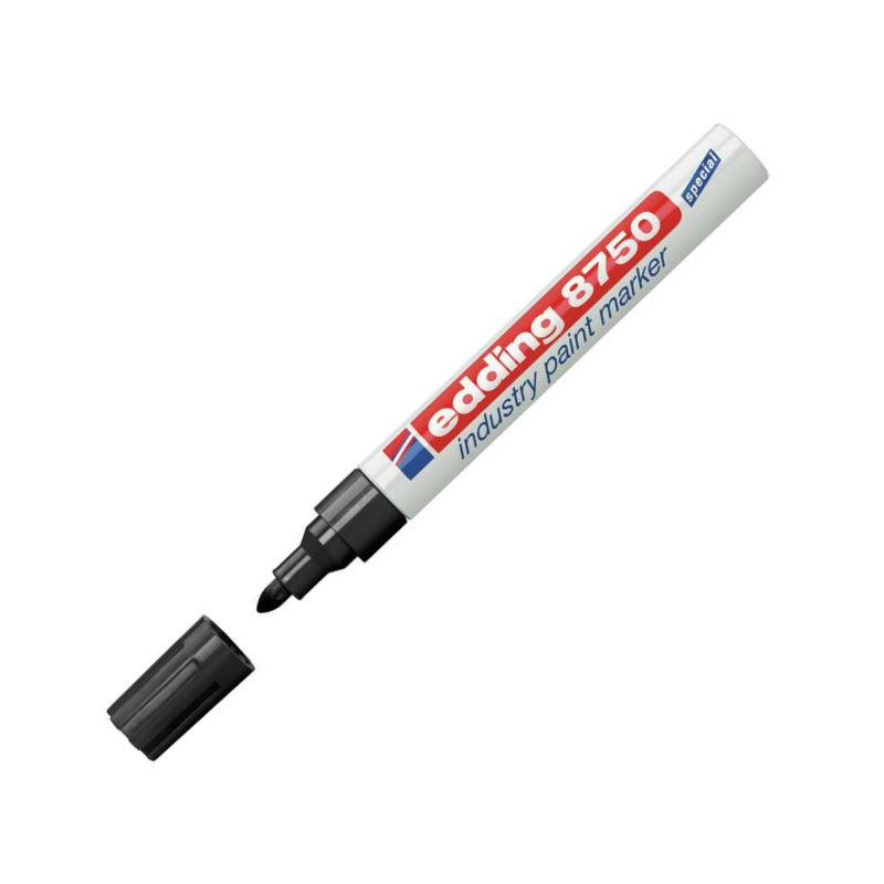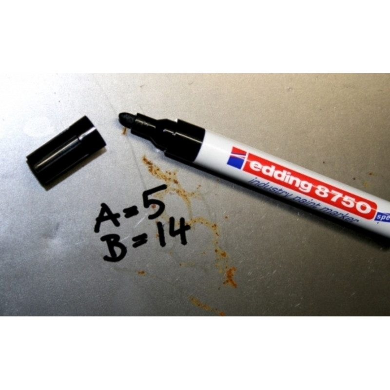 Промышленный лаковый маркер для промышленной, индустриальной графики, с пулевидным наконечником повышенной устойчивости к истиранию. Маркер универсален для нанесения маркировки и надписей в сложных, агрессивных промышленных условиях. Хорошо подходит для письма на грязных, жирных поверхностях. Выдерживает воздействие кислотами, растворителями, механическому воздействию. Стойкие чернила, ложатся густым плотным слоем с лаковым эффектом на гладкие и пористые поверхности. Надписи хорошо видно издалека на темных поверхностях. Специально разработанный состав маркера Edding 8750 растворяют масляную пленку на поверхности письма. Температурный режим краски маркера 300 °C. Максимальная температура поверхности при написании маркером не более 100 градусов по Цельсию. Толщина линии 2-4 мм. Размеры маркера: диаметр 15 мм, длина 141 мм. Инструкция по применению маркера: 1. Перед использованием хорошенько встряхнуть с закрытым колпачком. 2. Снимите колпачок, прижмите наконечник к поверхности, надавите и удерживайте пока не проступит краска. 3. Применять после того как убедитесь, что вытекает исходный цвет. Предостережение: плотно закрывайте колпачок после применения, держать маркер вдали от огня и прямых солнечных лучей.