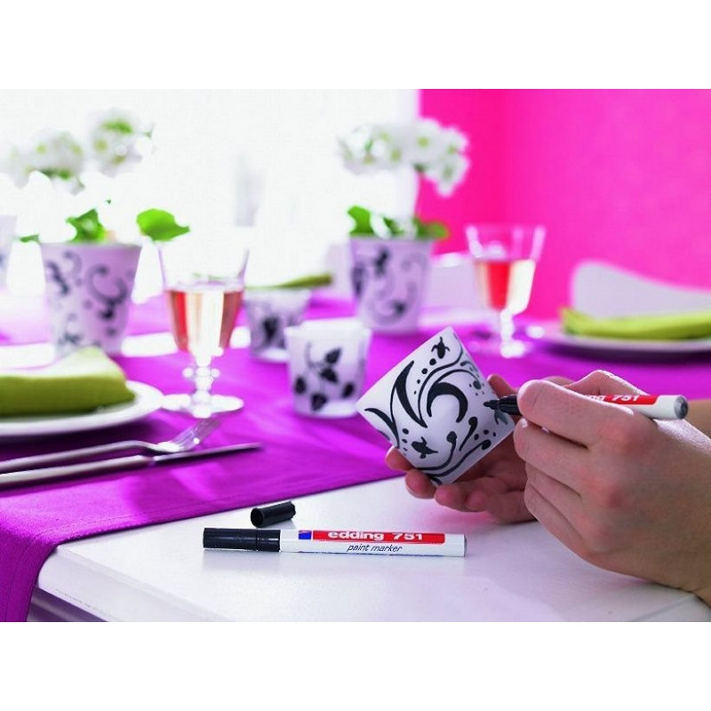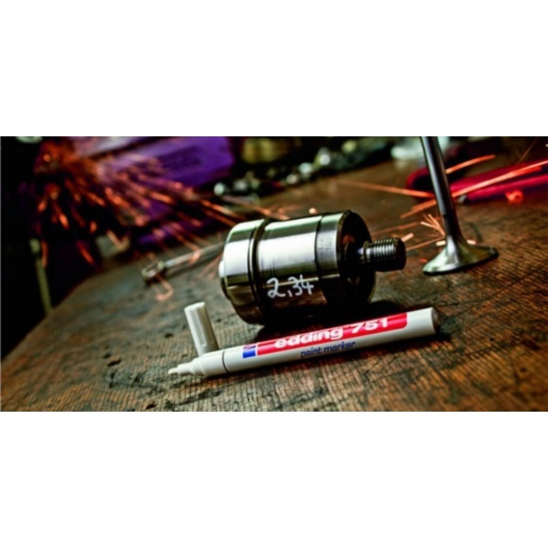 Универсальный маркер Edding 751 используется для промышленной непрозрачной маркировки практически всех материалов, например, стекла, пластика, дерева или металла. Может применяется для письма на жирных, пыльных, грязных поверхностях в индустриальных условиях. Лаковый маркер устойчив к кислотам, растворителям, механическому истиранию, свету. Высококонцентрированный пигмент хорошо ложится на гладкие и шероховатые поверхности. Специальные структуры, введенные в состав маркера Edding E 751, растворяют масляную пленку на поверхности письма, что дает яркую устойчивую надпись. Непрозрачные лаковые чернила позволяют делать хорошо заметные надписи густым плотным слоем даже на темных поверхностях. Корпус промышленного маркера изготовлен из алюминия. Маркер Edding E 751 имеет упроченный круглый (пулевидный) наконечник. Наконечник маркера может быть заменен по мере истирания. Благодаря тонкому наконечнику маркером может наносится маркировка на небольшие элементы и поверхности. Толщина линии - 1-2 мм. Поток чернил регулируется клапаном. Чернила маркера с лакирующим эффектом на основе нитрокраски. Водостойкий, быстро сохнет. Термостойкость надписи до 400 градусов по Цельсию. Надписи цветами 05-010, 049, 054 видимы до 1000 С. Маркер Edding E 751 хорошо зарекомендовал себя в работе при перепадах температур от -15 до 30. Промышленный лаковый маркер Edding Е-751 универсален. Используется, например, при нанесении меток на разнородные материалы. При маркировке изделий из резины, пластика, стекла, металла, кабеля, проводов, при нанесении маркировки на товары достаточно одного маркера - Edding E 751. Идеально подходит для маркировки грузов, приборостроения, технологической маркировки. Кроме того, маркер Edding E 751, благодаря разнообразной палитре цветов и свойствам красящего вещества, широко используется для декоративных и оформительских работ дизайнерами. используется в витражных работах, росписи по дереву и керамике, для других интерьерных работ. Инструкция по применению маркера: 1. Перед использованием хорошенько встряхнуть с закрытым колпачком. 2. Снимите колпачок, прижмите наконечник к поверхности, надавите и удерживайте пока не проступит краска. 3. Применять после того как убедитесь, что вытекает исходный цвет. Предостережения: плотно закрывайте колпачок после применения, держать маркер вдали от огня и прямых солнечных лучей.