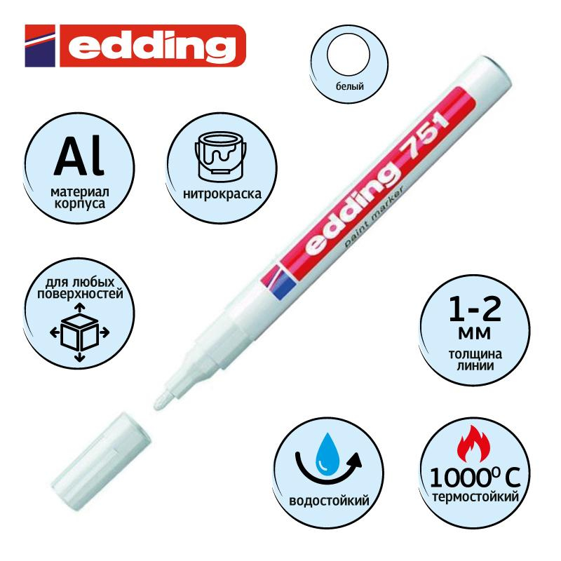 Промышленный лаковый маркер Edding E-751/49, цвет чернил - белый, предназначен для работы на любых материалах: стекло, пластик, дерево или металл. Эргономичный корпус изготовлен из алюминия. Круглый наконечник позволяет проводить линии толщиной от 1 до 2 мм. Быстросохнущие чернила белого цвета с лакирующим эффектом устойчивы к воздействию влаги. Температурный режим краски маркера 1000 ° C. Максимальная температура поверхности при написании маркером не более 100 градусов по Цельсию. Маркер не содержит ксилола, практически не имеет запаха Инструкция по применению маркера: 1. Перед использованием хорошенько встряхнуть с закрытым колпачком. 2. Снимите колпачок, прижмите наконечник к поверхности, надавите и удерживайте пока не проступит краска. 3. Применять после того как убедитесь, что вытекает исходный цвет. Предостережения: плотно закрывайте колпачок после применения, держать маркер вдали от огня, прямые солнечные лучи вызывают обесцвечивание.