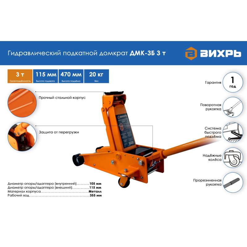 Домкрат гидравлический подкатной ДМК-3Б (3 т, 115-470 мм, быстрый подъём) Вихрь предназначен для поднятия автомобилей при шиномонтаже и ремонте. В целях безопасности все домкраты Вихрь оснащены защитой от перегрузки, которая не позволяет поднимать массу, превышающую допустимый максимум.Максимально допустимая масса 3 тонны, высота подхвата 115 мм, высота подъёма 470 мм. Оснащён системой быстрого подъёма, позволяющей поднять груз на максимальную высоту за 6 - 7 полных качков.