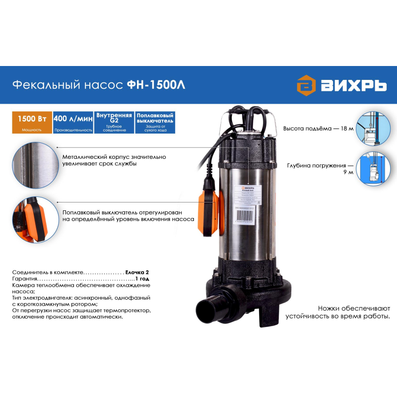 Фекальный насос 'Вихрь' ФН-1500Л с поплавковым выключателем предназначен для откачки загрязненных бытовых, сточных и смешанных вод, содержащих крупные включения, откачки из водоемов, а также для орошения, подачи воды с глубины. Оснащен специальным режущим лезвием. Диаметр насадки (штуцера) на выходе, к которому крепится шланг - 2 дюйма. Мощность насоса составляет 1500 Вт, что позволяет ему перекачивать до 24000 литров в час. Всасывающее окно располагается в нижней насосной части. Во избежание перегрева и преждевременного износа температура перекачиваемой жидкости не должна превышать 35°С. Насос не может использоваться при температуре окружающей среды ниже 1°С. Температура на обмотках двигателя контролируется термопротектором, в случае ее повышения автоматически срабатывает термозащита, отключая устройство. Специальные ножки обеспечивают устойчивость насоса во время эксплуатации. Внешний вид и/или характеристики товара могут быть изменены производителем в соответствии с производственным процессом.