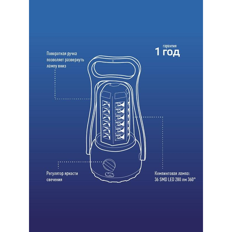 Фонарь кемпинговый светодиодный Космос КОСAс6008 аккумуляторный (входит в комплект) KOCAc6008LED оснащен 36LED элементами и регулируемым уровнем яркости. Диммер (регулировка яркости свечения) позволяет выбрать оптимальный режим свечения и расход заряда батареек. Имеет многофункциональную <nobr>ручку-трансформер</nobr> и крючок для подвешивания. Корпус ударопрочный и влагостойкий. Работает от аккумуляторной батареи 4V 2Ah, время работы до 8 часов, дальность свечения 10 м. Функция индикации процесса зарядки позволяет контролировать расход энергии. Размер: 120×115×238 мм.Внешний вид и/или характеристики товара могут быть изменены производителем в соответствии с производственным процессом.