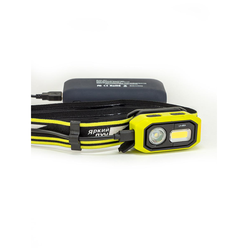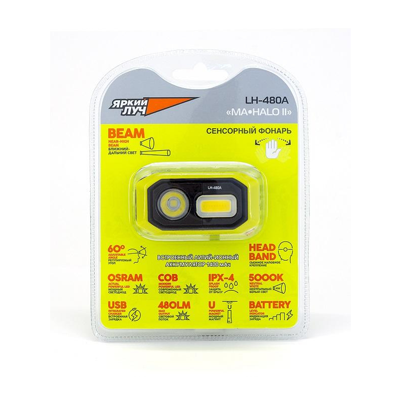 Фонарь налобный 'Яркий луч' LH-480A аккумуляторный (входит в комплект) - компактный налобный сенсорный фонарь со встроенным Li-Ion аккумулятором. Встроенный сенсор. Современный мощный светодиод Osram. Современный мощный светодиод COB. Нейтральный белый свет 5000 К. Максимальный световой поток 480 лм. Максимальная дальность света 79 м. Встроенный Li-Ion аккумулятор 1400 мАч. Индикатор батареи. Встроенное Tyce C- USB зарядное устройство. кабель Type C-USB в комплекте. Четыре режима работы. Диммирование яркости. Возможность снять фонарь с налобного крепления. Влагозащищенность IPX-4. Мощный магнит, встроенный в крепление.Отличительной особенностью LH-480A является возможность безопасной работы от внешнего аккумулятора (пауэрбанка) через порт USB. В этом случае встроенный аккумулятор фонаря автоматически отключается, что продлевает срок его службы. Кроме того, специальные клипсы позволяют удобно разместить провод пауэрбанка на стропе наголовного крепления. Для включения фонаря нажмите на кнопку (питание). Фонарь включится в последнем запомненном режиме. Повторное нажатие кнопки в течение 4-х сек будет переключать режимы: направленный свет 100% (300 лм, время работы 3 часа) => направленный свет 30% (90 лм, время работы 10 часов) => рассеянный свет 100% (250 лм, время работы 3,5 часа) => совмещенный свет (480 лм, время работы 1,4 часа). Для включения фонаря в режиме 'сенсор' нажмите на кнопку со значком Wifi. Теперь фонарь включится в последнем запомненном режиме от взмаха руки перед лицевой частью. Не работает с диммированием (только 4 фиксированных режима). Диммирование яркости. На включенном фонаре нажмите и удерживайте кнопку (питание) для плавного изменения яркости. При достижении максимального и минимального уровней яркости фонарь мигнет 2 раза. Диммирование работает во всех режимах. Гарантия 2 года. Внешний вид и/или характеристики товара могут быть изменены производителем в соответствии с производственным процессом.