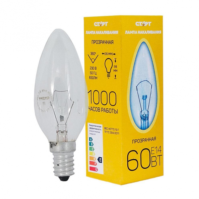 Лампа накаливания Старт с прозрачной колбой в форме свечи — это источник «теплого» освещения желтого цвета. Он наиболее привычен и приятен нашему глазу. Лампочка мощностью 60 Вт оснащена цоколем Е14 и подойдет к большинству офисных и бытовых светильников. Лампы с прозрачной колбой подходят для непрямого освещения в закрытых светильниках и в тех случаях, когда яркие искрящиеся световые эффекты важнее, чем отсутствие бликов. Средний срок службы ламп — до 1000 часов. Преимущества Мгновенное время включения, не требуется время для разогрева. Универсальное положение при горении. Привычные лампочки накаливания имеют невысокую стоимость. Не требует специальной утилизации, так как не содержит внутри токсических компонентов. Применение Общее освещение. Бытовое освещение.Внешний вид и/или характеристики товара могут быть изменены производителем в соответствии с производственным процессом.
