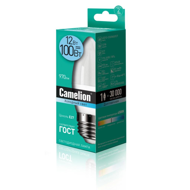 Лампа светодиодная Camelion LED12 C 12Вт E27 4500К 970Лм 220В 13690 Лампа светодиодная Camelion форма колбы свеча, современная альтернатива галогенным, люминесцентным лампам, подходит для светильников с цоколем E27. Является высокотехнологичным продуктом и отличается продолжительным сроком службы. Благодаря матовому покрытию стекла колбы, лампа равномерно излучает нейтральный холодный белый свет комфортный для глаз. Экономичнее и прочнее классической лампы накаливания. Безопасность эксплуатации в жилых, рабочих и других помещениях. Преимущества:Включается мгновенно на полную яркость;Отсутствует ультрафиолетовое и инфракрасное (тепловое) излучение; Экологически и пожаробезопасна, не содержит ртути и других вредных химических веществ; Отсутствуют низкочастотные пульсации светового потока, негативно влияющих на зрение; Специальной утилизации не требует;Высокая устойчивость к вибрациям и ударопрочность — не имеет нить накаливания и хрупкие стеклянные трубки; Стабильность работы при перепадах напряжения;Срок службы длительный;LED, высокая цветопередача;Экономит электроэнергию до 90% без ущерба для освещенности и качества света;Возможность эксплуатации при температуре от -30°C до 40°C.Применение: Основное и акцентное освещение;Общее освещение.Внешний вид и/или характеристики товара могут быть изменены производителем в соответствии с производственным процессом.