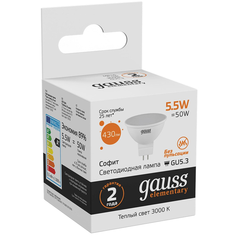 Светодиодная лампа формы софит Gauss (матовая), излучает теплый белый свет, с цоколем GU5.3, мощность 5,5 Вт. Является лучшей альтернативой галогенным лампам, аналогам ламп накаливания 35–50 Вт. Лаконичная форма, высокий индекс цветопередачи, позволяющий создавать любые дизайнерские эффекты. Экологически безопасна, не содержит ртуть и другие вредные вещества. Не требует специальной утилизации. Серия модели Gauss Elementary.Преимущества изделия:— Срок службы 25000 h— Степень защиты (IP): IP20— Низкая энергозатратность— Устойчива к перепаду напряжения— Отсутствие мерцательного эффектаХарактеристики изделий:— Коэффициент цветопередачи Ra 80–89— Световой поток 430 Лм— Цветовая температура 3000 КОсновные габариты (мм):— Длина 45 мм (L)— Диаметр 50 мм (D)Области применения:— Бытовое освещение, успешно используются для встраивания в мебель— Коммерческое освещение: освещение витрин— Наружное освещение: в ландшафтных и тротуарных светильникахВнешний вид и/или характеристики товара могут быть изменены производителем в соответствии с производственным процессом.