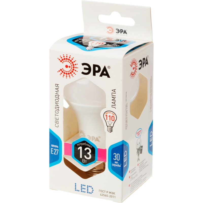Светодиодная лампа классической формы груши ЭРА (матовая), излучает естественный белый свет, с цоколем E27, мощность 13 Вт. Современный, качественный и доступный источник света. Создает яркое ровное освещение и экономит до 90% электроэнергии по сравнению с лампой накаливания с аналогичным световым потоком. Модель LED A60-13W-840-E27. Преимущества изделия: - Срок службы 30000 h - Низкое энергопотребление - Диапазон рабочих температур от - 25 до 50°C - Мгновенно включается и не нагревается Характеристики изделий: - Коэффициент цветопередачи Ra 80 - Световой поток 1040 Лм - Цветовая температура 4000 К Основные габариты (мм): - Длина 111 мм (L) - Диаметр 60 мм (D) Области применения: - Бытовое использование: потолочные, настенные, настольные светильники, люстры и бра - Коммерческое освещение: салоны красоты, столовые, кафе, рестораны, фитнес-центры и т. д. Внешний вид и/или характеристики товара могут быть изменены производителем в соответствии с производственным процессом.
