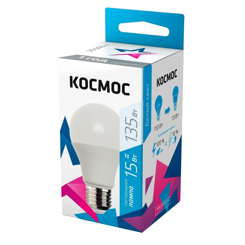 Лампа светодиодная Космос, А 15Вт E27 4500К 1300Лм 240В LkecLED15wA60E2745 Лампа светодиодная Космос в стеклянной колбе излучает нейтральный белый свет, поэтому идеально может подойти как для помещений производственного, так и бытового назначения. Идеальное сочетание цены и качества не оставит равнодушным ни одного покупателя. Традиционный цоколь Е27 подходит для использования в люстрах, светильниках, настольных лампах. При применении в дизайнерских решениях такой свет визуально может увеличить комнату.Преимущества:Быстрое включение без необходимости ожидания;Длительный срок службы;Компактные габариты;Малый вес.Применение:Основное освещение;Общее освещение.Внешний вид и/или характеристики товара могут быть изменены производителем в соответствии с производственным процессом.
