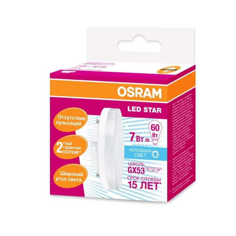 Плоская светодиодная лампа Osram, излучает естественный белый свет, с цоколем GX53, мощность 7 Вт. Компактные размеры, небольшой вес и низкий профиль. Эксплуатация при сетевом напряжении от 220 до 240 В. Код модели LSGX5360 7W/840. Преимущества изделия: - Срок службы 15000 h - Хорошее качество света - Простой монтаж - Отличная относительная световая эффективность Характеристики изделий: - Коэффициент цветопередачи Ra 80 - Световой поток 575 Лм - Цветовая температура 4000 К Основные габариты (мм) см. фото № 4: - Высота 24 мм (Н) - Диаметр 75 мм (D) - Вес продукта 44,5 г/шт. Области применения: - Зональное освещение, фоновое освещение - Бытовое использование, освещение входа, освещение кухни - Выставки, универсальные магазины - В качестве светильника направленного света для обозначения проходов, дверей, лестниц и т. д. - Только для внутреннего применения Лицензиатом торговой марки Osram в общем освещении является компания Ledvance. Внешний вид и/или характеристики товара могут быть изменены производителем в соответствии с производственным процессом.