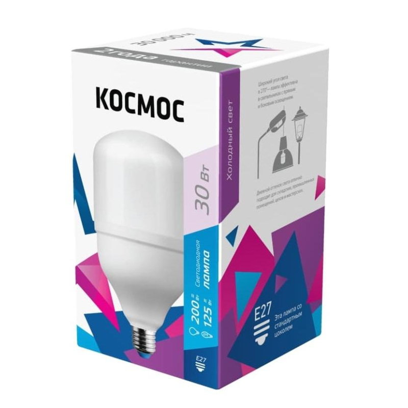 Лампа светодиодная Космос 30W E27 6500k излучает холодный белый свет. Лампа подходит как для бытового применения, так и для использования в промышленной сфере. Переходник Е40 в комплекте. Лампы с высокой цветовой температурой обладают чрезвычайно активизирующим воздействием на психику человека. При краткосрочном использовании такой свет стимулирует организм, а при долгосрочном возможен обратный эффект — торможения, депрессии. Так что такое освещение используется в местах, где присутствие работников минимально и краткосрочно: это может быть склад, цех автоматизированного производства или освещение в морозильных камерах либо для больших помещений. </pr>Внешний вид и/или характеристики товара могут быть изменены производителем в соответствии с производственным процессом.