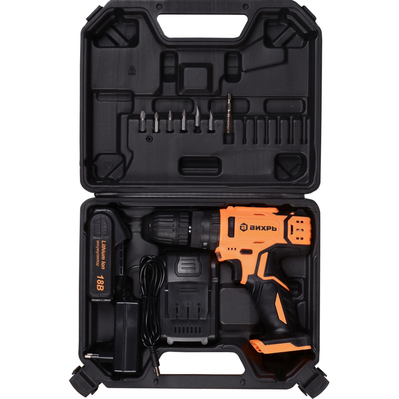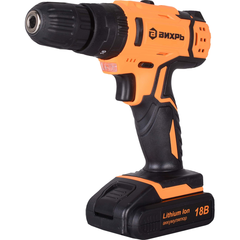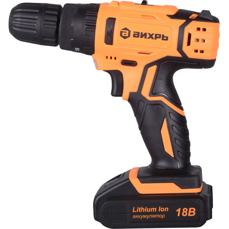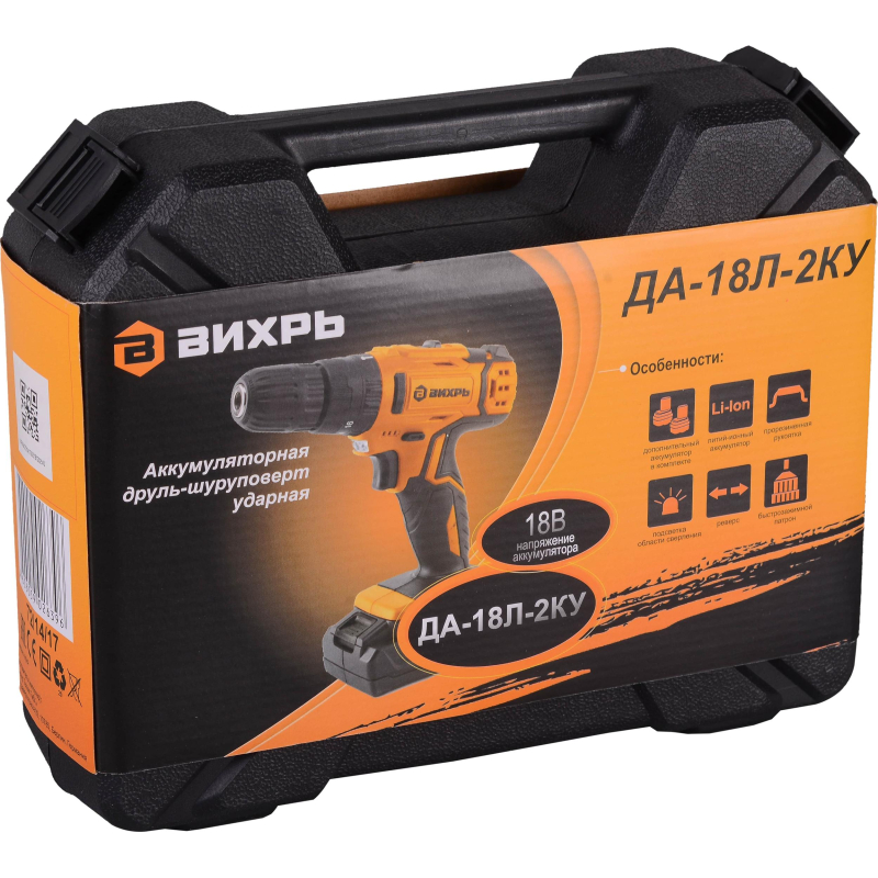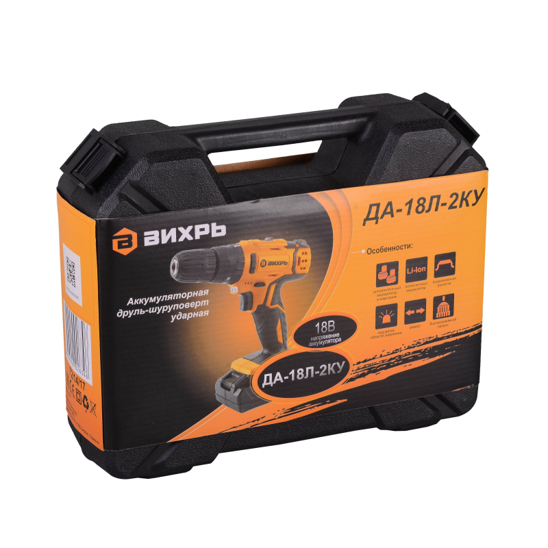Дрель-шуруповерт Вихрь ДА-18Л-2КУ имеет в своем составе ударный механизм. Перед вами — производительный и очень удобный в использовании инструмент, который подойдет для решения задач профессионального класса. Вы сможете не только работать с крепежом, но и сверлить отверстия. Максимальная частота вращения — 1350 оборотов в минуту. Можно использовать 2 скоростных режима. Первый режим (скорость на котором меньше, чем максимальная) можно, в частности, использовать при сверлении керамической плитки.<br /> Дрель-шуруповерт Вихрь ДА-18Л-2КУ оснащена патроном быстрозажимного типа. Доступный диапазон диаметров зажима — от 0.8 до 10 мм. Имеется подсветка рабочей зоны, польза от применения которой несомненна даже при высоком уровне освещенности в помещении (или на улице, если работа ведется вне здания).<br /> Для питания инструмента используется энергия, источником которой является литий-ионный аккумулятор, имеющий высокую (2 А·ч) емкость. Время зарядки батареи — 1 ч. В комплект входят два аккумулятора, поэтому вы сможете организовать бесперебойную работу. Также в комплекте — кейс и зарядное устройство.Внешний вид и/или характеристики товара могут быть изменены производителем в соответствии с производственным процессом.