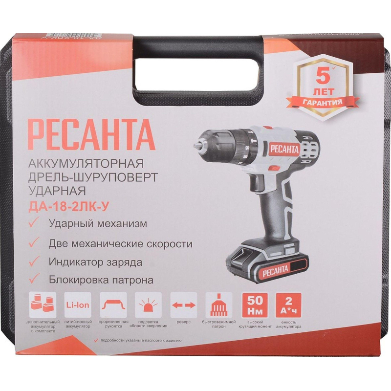 Дрель-шуруповерт аккумуляторная ДА-18-2ЛК-У Ресанта является усовершенствованной версией модели ДА-18Л-2К с дополнительной функцией долбления со сверлением. Используется для просверливания отверстий в деревянных, пластмассовых и металлических изделиях или для работы в качестве шуруповерт. Модель оснащена 2 аккумуляторами и кейсом, незаменима для людей, постоянно использующих дрели-шуруповерты в быту.Прорезиненная рукоять обеспечивает удобное и надежное удержание инструмента в руке во время работы. Быстрозажимной патрон облегчает замену рабочей оснастки. Двухскоростной редуктор для удобства ведения различных работ. Реверсивный механизм предназначен для быстрого изъятия сверла из материала в случае застревания, выкручивания или ослабления крепежа. С помощью регулировки частоты вращения инструмент можно настроить под необходимую толщину материала. Модель работает от надежного литий-ионного аккумулятора (Li-Ion).Преимущества:- Дрель оснащена функцией сверления с ударом;- Удлиненная форма устройства обеспечивает удобство при сверлении в труднодоступных местах, а также усиливает корпус позволяя закручивать крепеж с наименьшими трудозатратами;- Легкий вес и прорезиненная ручка обеспечивает комфортную работу даже при длительном использовании шуруповерта;- Возможность регулировки крутящего момента позволяет использовать шуруповерт для работы практически с любым материалом (дерево, металл, пластмасса);- Быстрозажимной патрон позволяет легко и быстро менять биты или сверла.- Наличие кейса позволяет хранить в безопасности шуруповерт, а также облегчает его транспортировку.Кроме того, литий-ионный аккумулятор имеет ряд преимуществ:- не имеют 'эффекта памяти', а значит могут заряжаться из любого состояния;- обладают минимальной способностью саморазрядки;- имеют значительную емкость;- обладают троекратным превосходством перед никель-кадмиевыми источниками питания по количеству циклов зарядки-разрядки;- имеют небольшие размеры, что объясняется конструкцией источника питания, состоящего из нескольких миниатюрных элементов.Внешний вид и/или характеристики товара могут быть изменены производителем в соответствии с производственным процессом.