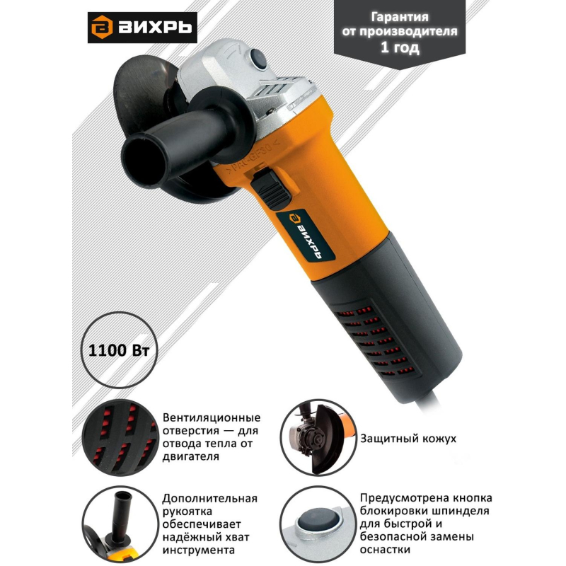 Шлифовальная машина угловая или как часто называют, болгарка, ВИХРЬ УШМ-125/1100 72/12/2 , используется для резки твердых металлов и камня, обдирки, зачистки, шлифовки поверхностей с помощью абразивного диска для резки или шлифовки определенного типа материала. Отрезные диски значительно тоньше шлифовальных. Каждый вид диска предназначен для определенного типа материала, в обратном случае можно получить травму, сломать диск или машину. Углошлифовальная машина ВИХРЬ УШМ-125/1100 72/12/2 - корпус редуктора выполнен из металла. Боковая рукоятка фиксируется в двух положениях для более удобной работы. Вытянутый корпус обеспечивает надежное удержание углошлифовальной машины во время работы. На корпусе инструмента предусмотрены вентиляционные отверстия, которые защищают рабочий механизм от перегрева. Пильный диск закрыт кожухом для защиты оператора от травм. Предусмотрена кнопка блокировки шпинделя для быстрой и безопасной замены оснастки. Характеристики изделий: Мощность мотора 1100 вт Головка шпинделя М14 Максимальное количество оборотов 11000 об/мин Основные габариты: Диаметр диска 125 мм Размеры 97x118x320 мм Вес - 2.3 кг Комплектация: УШМ Боковая рукоятка Паспорт Упаковка Внешний вид и/или характеристики товара могут быть изменены производителем в соответствии с производственным процессом.