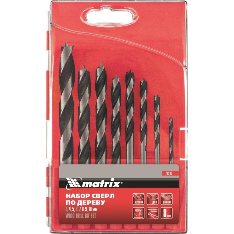 Сверла по дереву предназначены для сверления отверстий разных диаметров в деревянных изделиях.Инструменты изготовлены из конструкционной углеродистой стали марки 45.Соответствуют высоким требованиям к точности изготовления, износостойкости, рассчитаны на продолжительную интенсивную эксплуатацию.Особенности линейки наборов сверл Matrix:Полированная поверхность сверл гарантирует точные и чистые отверстия без сколов;Рабочая часть сверл закалена до твердости 38-48 HRC по Роквеллу;Пригодны для использования с древесиной любой твердости;В наборах 70283 и 70285 хвостовики имеют шестигранную форму, что предотвращает поворот сверла;Для удобства хранения и транспортировки сверла упакованы в пластиковый кейс.Внешний вид и/или характеристики товара могут быть изменены производителем в соответствии с производственным процессом.
