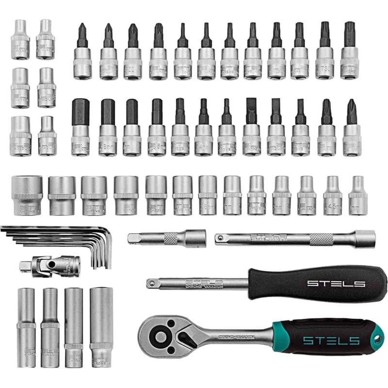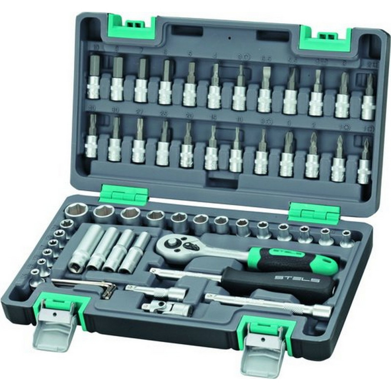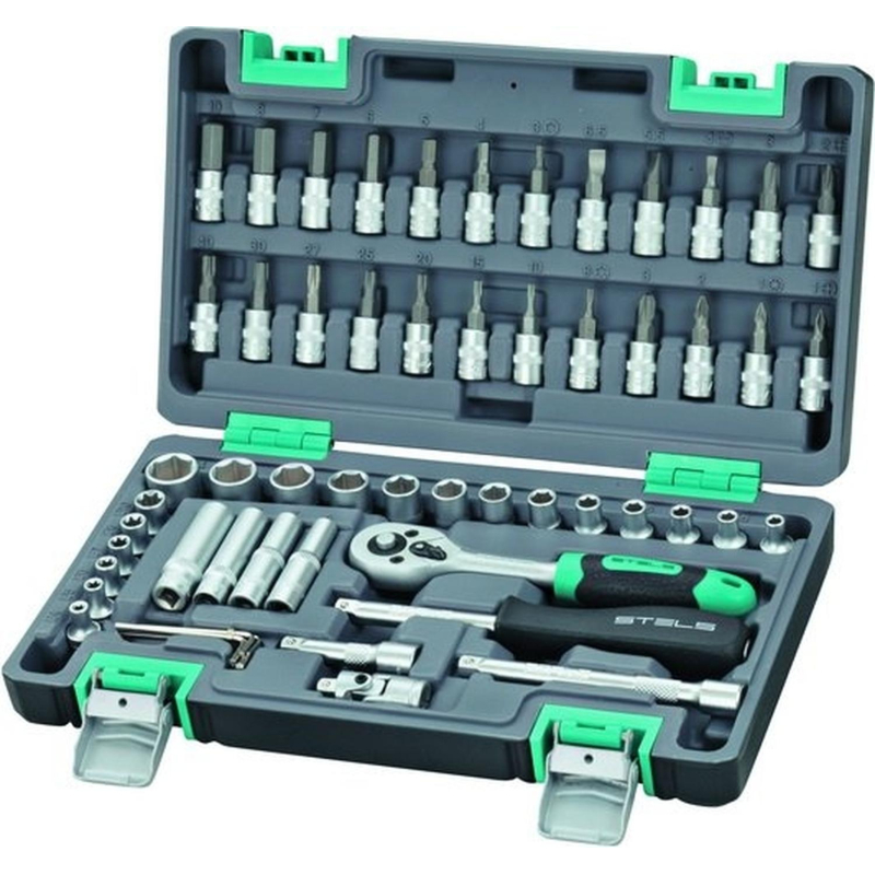 Набор инструмента автомобильный Stels 57 предметов (14101) состоящий из 57 предметов, упакованных в пластиковый кейс с металлическими замками-защелками и индивидуальными отделениями. С помощью отверток, ключей, шестигранников, удлинителей, кардана и прочих инструментов, входящих в набор, можно осуществлять ремонт садовой техники и бытовых конструкций, а также обычный ремонт дома или на даче. Инструменты изготовлены из стали, обладающей высокой твердостью и легкостью. Положите набор инструмента в свой автомобиль, и он всегда будет у вас под рукой. На весь комплект фирмой-производителем предоставляется пожизненная гарантия. В набор входят: Ключ трещоточный 1/4 дюйма; головки торцевые 1/4 дюйма; 4, 4,5, 5, 5,5, 6, 7, 8, 9, 10, 11, 12, 13, 14 головки торцевые 1/4 дюйма; удлиненные: 6, 7, 8. Кардан 1/4 дюйма; Удлинители 1/4 дюйма; 50 и 100 мм. Отвертка-держатель 1/4 дюйма; Ремонтный комплект шестигранных ключей: 1,5 мм. 2,0 мм. 2,5 мм. 3,0 мм. 3,5 мм. головки торцевые 1/4 дюйма со вставкой: Т8, Т10, Т15, Т20, Т25, Т27, Т30, T40, PH1, PH2, PH3, PZ1, PZ2, PZ3, H3, H4, H5, H6, H7, H8, H10, SL4, SL5,5, SL6,5; головки торцевые 1/4 дюйма; E4; E5; E6; E7; E8; E10 10. Кейс.Внешний вид и/или характеристики товара могут быть изменены производителем в соответствии с производственным процессом.
