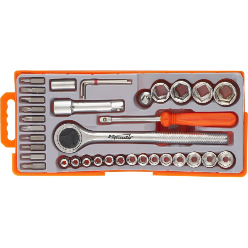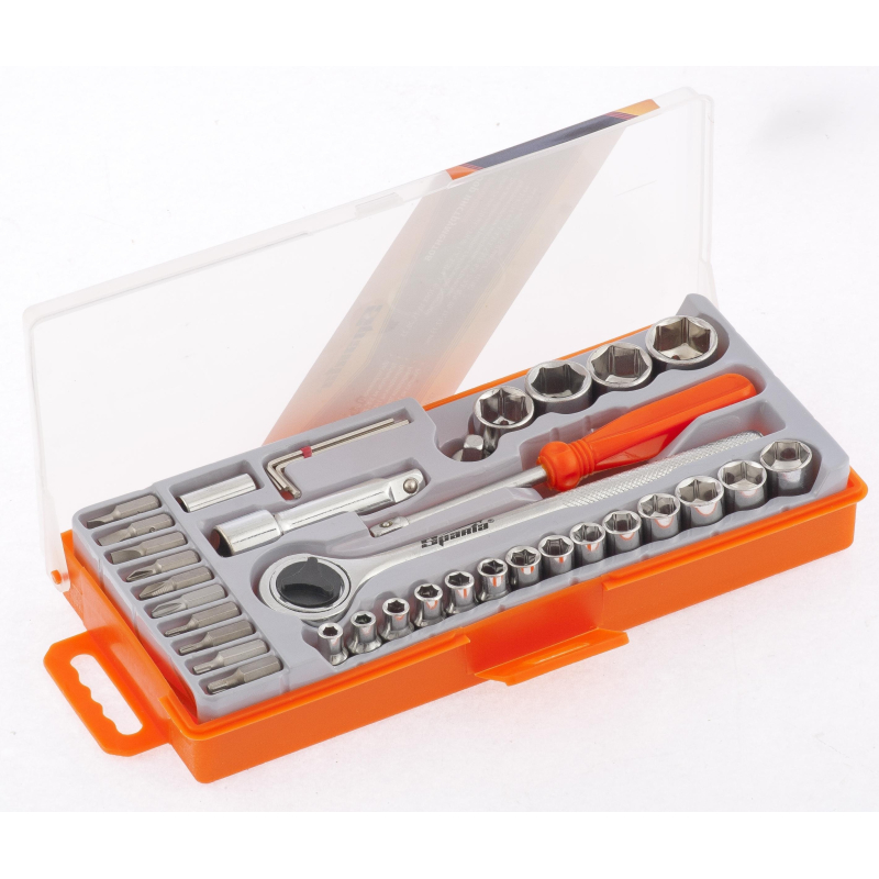 Набор инструмента автомобильный Sparta 36 предметов (13541) включает в себя 36 предметов. Упакован в удобный кейс с замками-защелками. С помощью этого инструмента можно осуществлять ремонт садовой техники и бытовых конструкций, а также обычный ремонт дома или на даче. Такой кейс не займет много места в автомобиле. Комплектация: Ключ трещоточный 3/8 1 шт. головки торцевые 6-гранные 1/4 дюйма; (4, 4,5, 5, 5,5, 6, 6,5, 7, 8, 9 мм.) 9 шт. головки торцевые 6-гранные 3/8 дюйма; (10, 11, 12, 13, 14, 16, 17, 19 мм.) 8 шт. Ключи имбусовые (1,5, 2, 2,5 мм.) 3 шт. Удлинитель 3/8 1 шт. Переходник для бит 1/4 дюйма; 1 шт. Диск для облегчения работы 1 шт. Отвертка с квадратом 1/4 дюйма; 1 шт. Биты 1/4 дюйма; в обойме (PH 1-2-3, SL 4-5-6, T 10-15-20-25) 10 шт. Кейс 255х113х40 мм.Внешний вид и/или характеристики товара могут быть изменены производителем в соответствии с производственным процессом.