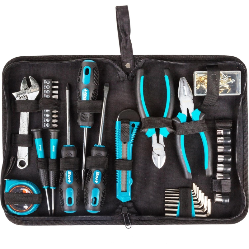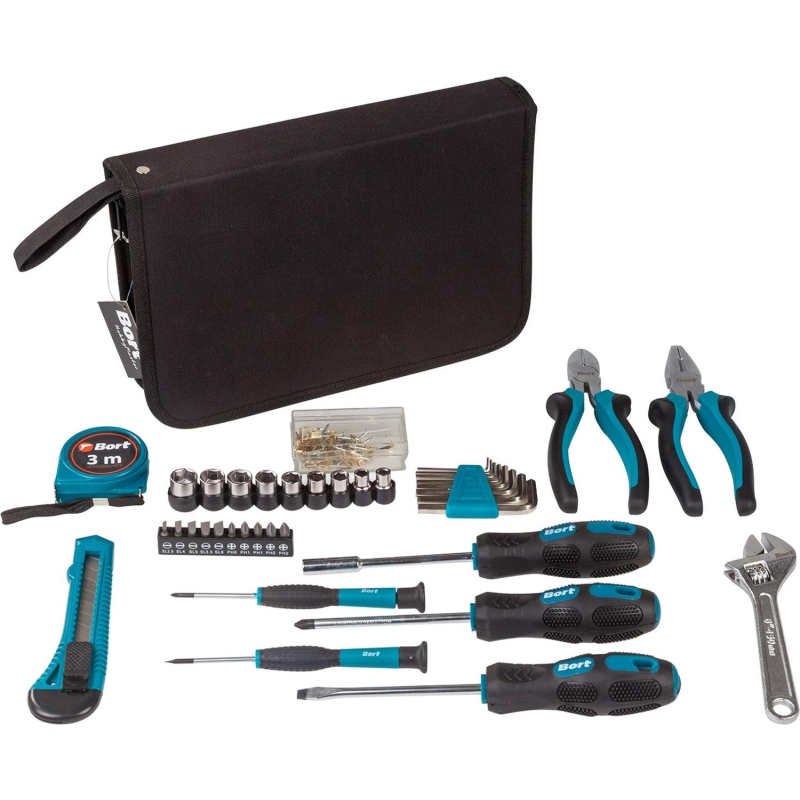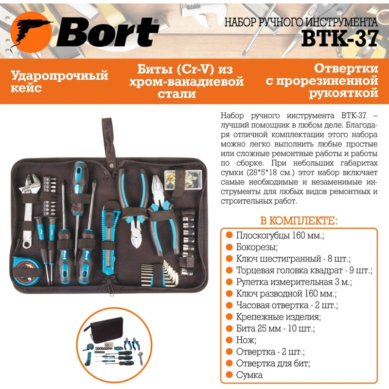 Набор инструмента столярно-слесарный BortBTK-37 37 предметов (93722388) этот потрясающий высококачественный набор станет прекрасным подарком и лучшим помощником для любого мужчины, как опытного мастера, так и любителя домашнего ремонта. Набор ручных инструментов ВТК-37 прекрасно справится с любой задачей: неисправность сантехники, электропроводки, сборка и ремонт мебели, В комплект входит самый необходимый набор инструментов: несколько видов отверток, пассатижи, биты, шестигранные ключи, торцевые головки разного диаметра, разводной ключ, бокорезы, канцелярский нож, рулетка. Все они изготовлены из прочного металла с прорезиненными ручками для более удобного и уверенного использования. Преимуществом данного комплекта ВТК-37 является удобная сумка для хранения со специальными креплениями для каждой составляющей набора, что позволяет всегда найти именно то, что необходимо. А компактный размер набора позволяет разместить его практически в любом месте: от кладовой до багажника машины. Этот набор имеет оптимальное сочетание всего необходимого:Бита 25 мм. 10шт (2.5, 4, 5, 5.5, 6, PH0, PH1, PH1, PH2, PH2)БокорезКлюч разводнойКлюч шестигранный 8шт (1,5; 2; 2,5; 3; 4; 5; 5,5; 6)Крепежные изделияНожОтвертка 100 мм. 2шт (PH2, SL6)Отвертка для битПлоскогубцыРулетка измерительная 3 мТорцевая головка квадрат 9шт (5, 6, 7, 8, 9, 10, 11, 12, 13)Часовая отвертка 50 мм. 2 шт (SL3, HP1)СумкаВнешний вид и/или характеристики товара могут быть изменены производителем в соответствии с производственным процессом.